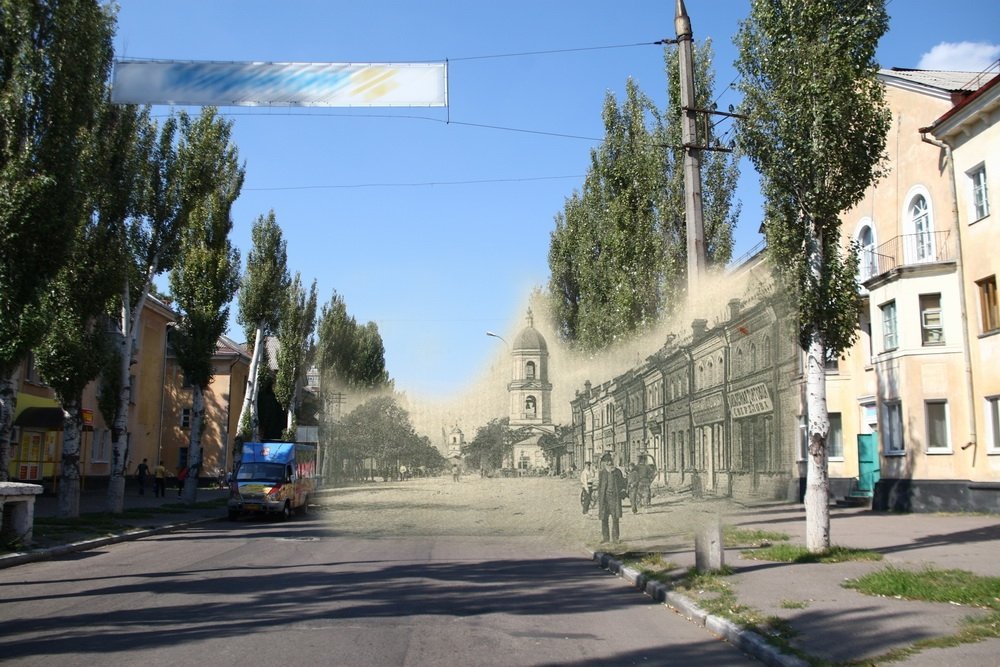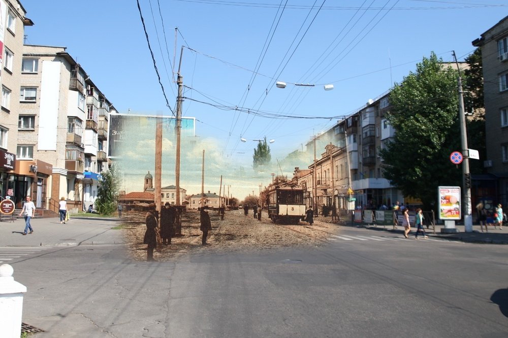 На цьому фото видніється Покровська церква, яку нещодавно відкопали на території 14-ї школи. Вид з перехрестя сучасних вулиць Першотравнева та Шевченка в бік залізничного вокзалу