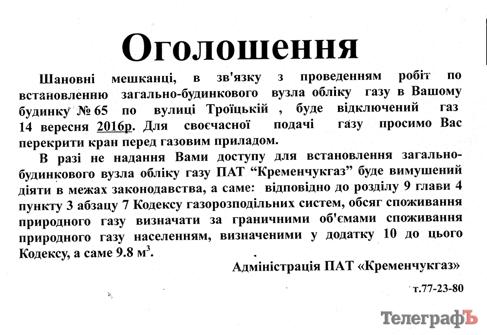 Группа сотрудников «Кременчуггаз» во главе с начальником участка по работе с должниками Дмитрием Бакаевым прибыла к дому №13 для установки общедомового газового счетчика. Руководитель группы г-н Бакаев сообщил жильцам, что в случае препятствования установке домового счетчика, компания в платежках выставит им счет за газ не по утвержденной Кабмином норме 4,4 куб. м на гражданина, а по норме 9,8 куб.м на гражданина – соответственно, заплатят жильцы за газ намного больше, поэтому сопротивление бесполезно и даже вредно. Г-н Бакаев сослался на то, что компания действует, руководствуясь нормами Постановления НКРЭ №2494 от 30.09.2015 и Кодексом газораспределительных систем, р.ІХ гл.4, п.3, аб.7 которого предусмотрена именно такая норма (9,8 куб.м) для потребителей, отказавшихся от установки газовых счетчиков.