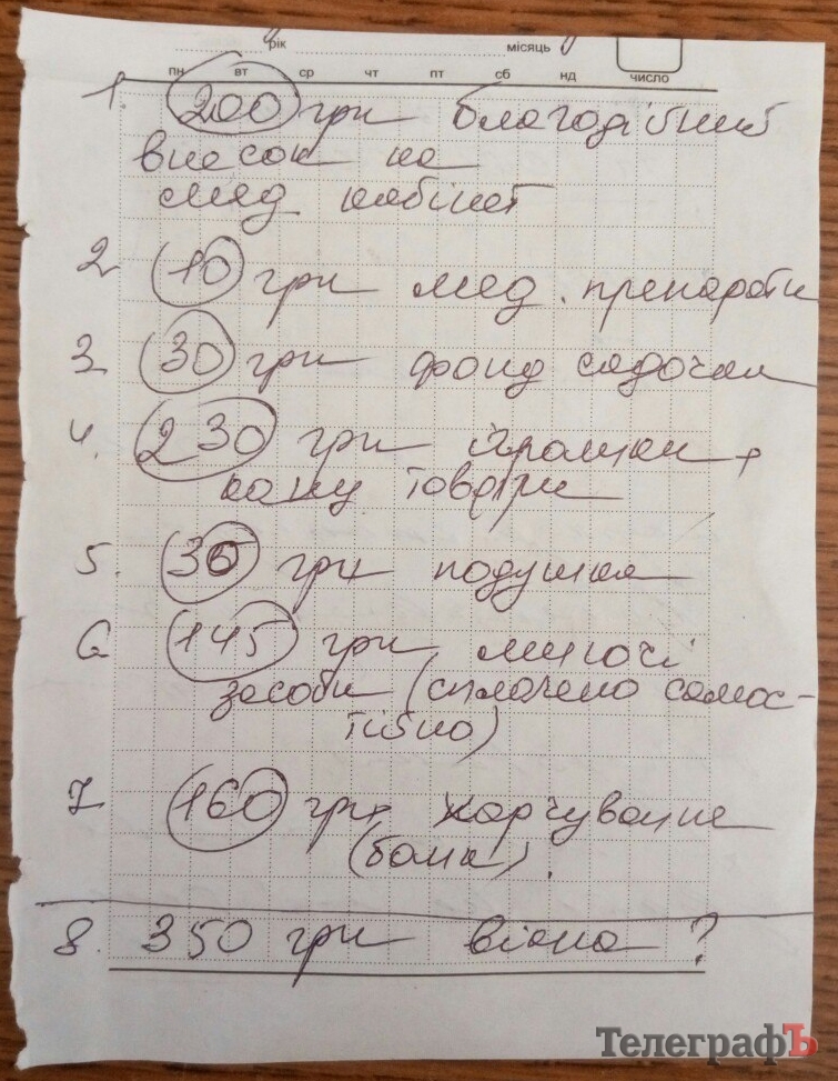 Ще у серпні 2016-го депутат Сідерка запропонувала кременчужанам телефонувати на її мобільний та повідомляти про примусові благодійні внески у школах і дитсадках. За цей час вона отримала чимало дзвінків і ще більше SMS-повідомлень. Найбільше їх було про примусові благодійні внески у дитсадках. На фото перед вами список, складений мамою маленького хлопчика. Як бачите, тут гроші і на іграшки, і на канцтовари, і на миючі засоби, і на медпрепарати, і навіть на подушку. А потім ще й 350 гривень на вікна. Загалом більше тисячі гривень, тож не дивно, що у мами був шок. Після зустрічі депутата Сідерки з батьками вихованців дитсадка відбулося спілкування з керівником закладу. Завідувачка дитсадка пообіцяла, що надалі, аж до 1 січня 2017-го року, з батьків вихованців не вимагатимуть більше коштів ані на канцтовари, ані на вікна і подушки, лише плату за харчування (це абсолютно законно).