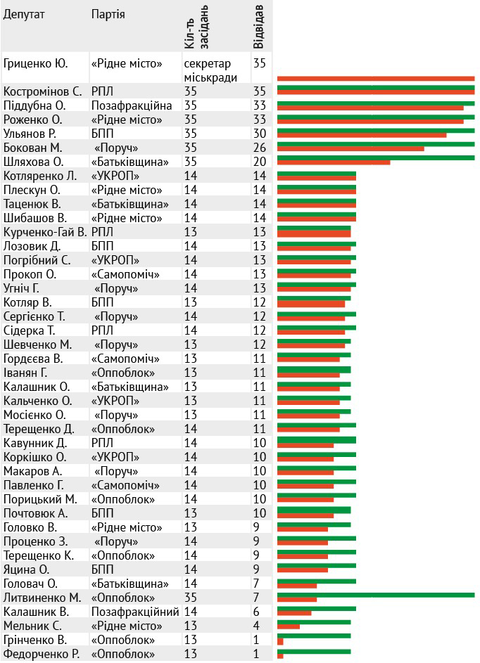 На жаль, депутати відвідують засідання комісій набагато гірше, ніж сесійні засідання. Тут найзатятіші прогульники – депутат Литвиненко (Опоблок, із 35 засідань комісії відвідав 7); Грінченко (Опоблок, з 13 засідань відвідав 1); Федорченко (Опоблок, із 13 засідань відвідав 1); Мельник («Рідне місто», з 13 засідань відвідав 4).