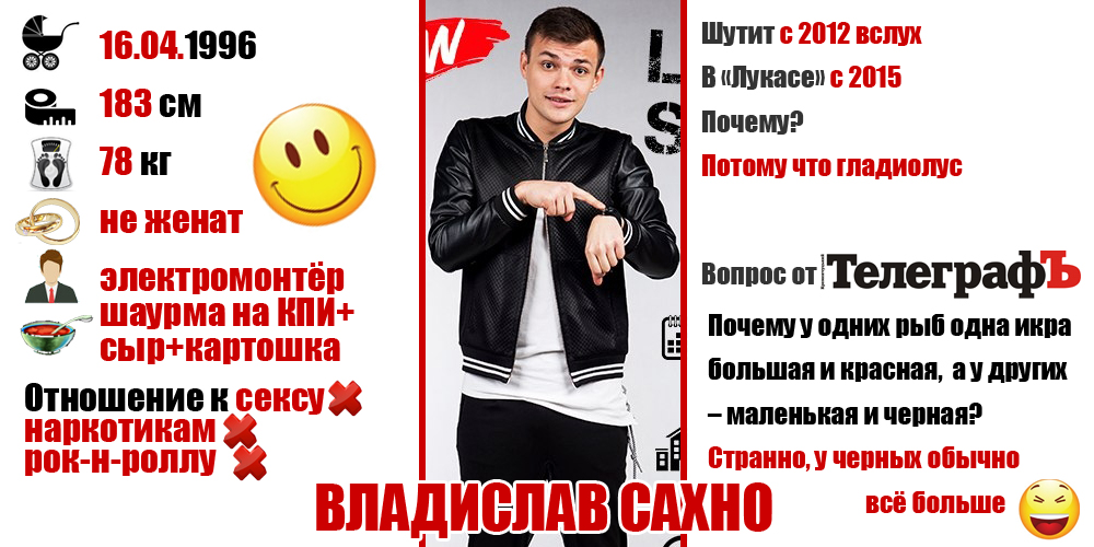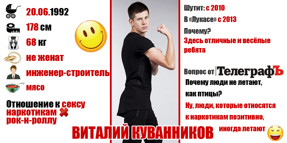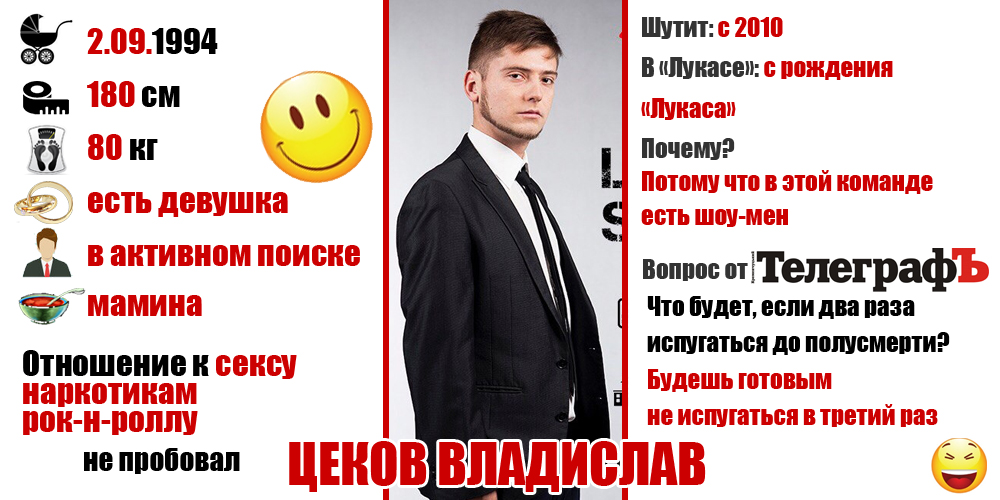 28 ноября Сборная Кременчуга «Лукас» стала третьей в финале телевизионного шоу «Лига Смеха», а уже 11 декабря состоится их дебютный сольный концерт. Все мы болели за ребят в «Лиге Смеха» и гордились своими земляками, но немногие из нас смогли бы узнать их на улице, а тем более назвать по имени. «ТелеграфЪ» решил исправить эту досадную несправедливость и подготовил для своих читателей досье на каждого из 12 кременчугских лигасмешников. Знакомьтесь - Сборная Кременчуга «Лукас»: