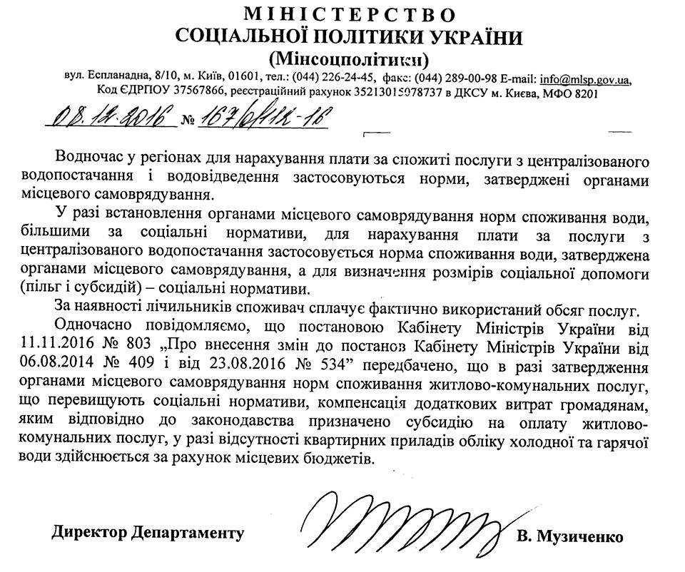 Натомість вищий орган – Міністерство соціальної політики (лист від 8.12.16 р.), яке визначає порядок отримання субсидій, вказує, різницю повинен покривати місцевий бюджет. При цьому посилається на свіжу Постанову КМУ №803 від 11.11.16 р., якою були внесено зміни до попередніх нормативно-правових актів.