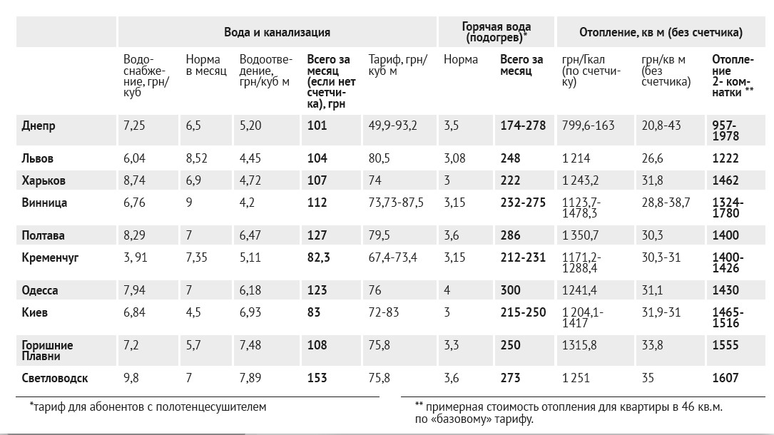 Кременчугские тарифы – они выше или ниже, чем в других городах? Где в Украине сейчас жить выгоднее по коммуналке? Где за отопление платят 3 грн за кв м, а кому достался тариф более 40 гривень? «ТелеграфЪ» взялся посмотреть коммунальные тарифы других городов страны. Мы решили узнать, как наши расценки отличаются от столичных, сколько платят жители Днепропетровска, Харькова, Одессы и других крупных городов. А заодно и заглянуть к соседям – в Полтаву, Светловодск и Горишние Плавни (экс-Комсомольск). Выяснили, что мы не из самых дорогих, но жителям многих городов повезло больше.