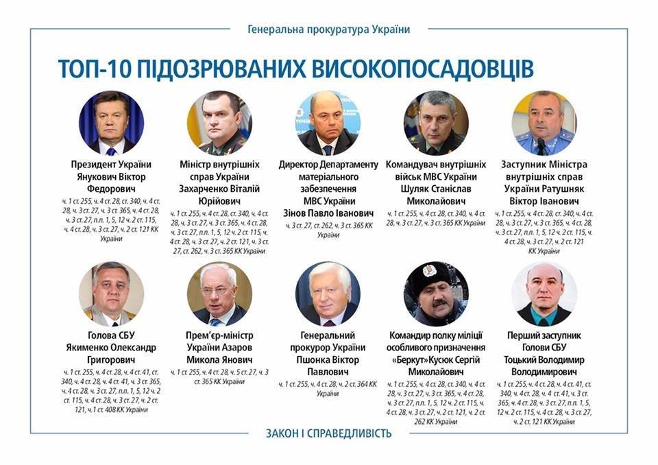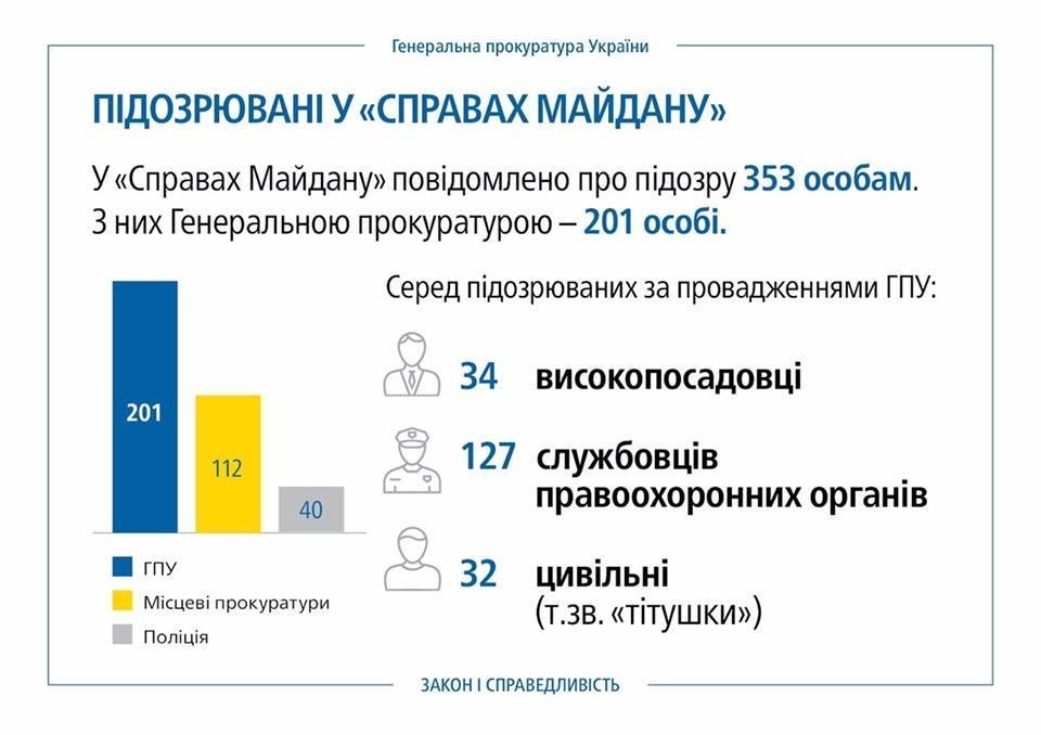 353 особам повідомлено про підозру. Серед підозрюваних за провадженнями ГПУ: 34 посадовця, 127 службовців правоохоронних органів та 32 цивільні особи (т.зв. “тітушки”).