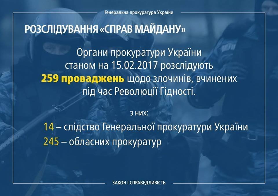 Генеральна прокуратура України на офіційному сайті опублікувала результати розслідувань справ Революції гідності за три роки. Станом на 15.02.17 розслідують 259 проваджень щодо злочинів, вчинених під час Революції гідності. З них: 14 – слідство Генеральної прокуратури та 245 проваджень в обласних прокуратурах.