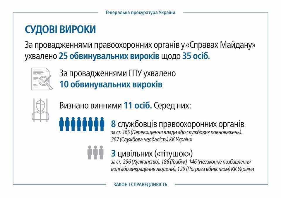 За цей час ухвалено 25 обвинувальних вироків щодо 35 осіб. Визнано винними 11 осіб. Серед них: 8 службовців правоохоронних органів (за с. 365 – перевищення службових повноважень та ст. 367 – службова недбалість) та трьох цивільних (“тітушок” за ст 296 хуліганство, ст. 186 – грабіж, чт. 146 – незаконне позбавлення волі або викрадення людини, 129 – погроза вбивством).