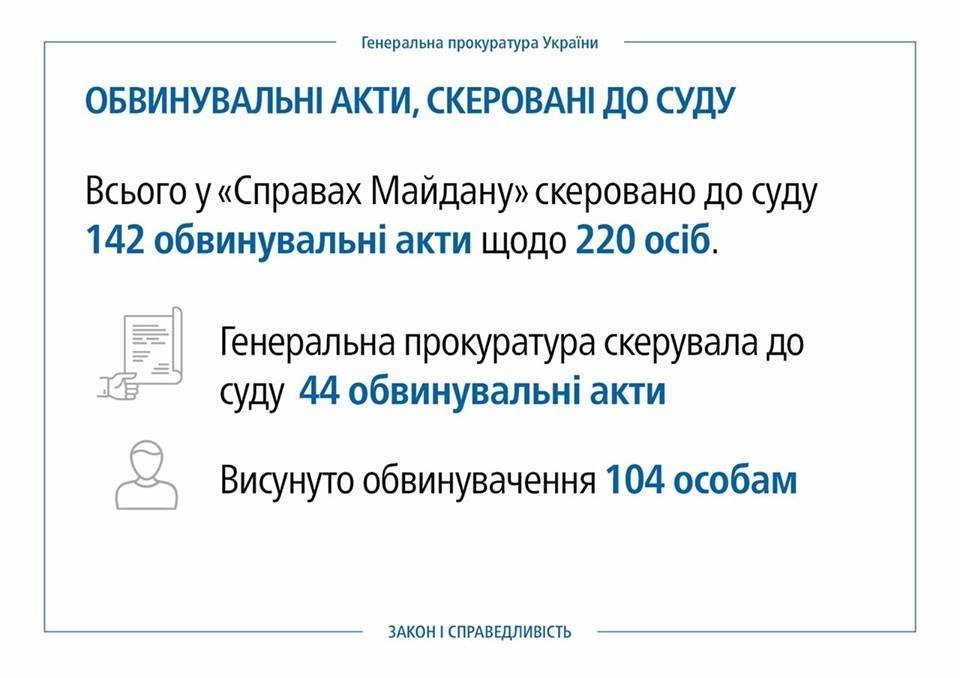 Всього у “Справах Майдану” скеровано до суду 142 обвинувальні акти щодо 220 осіб. Генеральна прокуратура скерувала до суду 44 обвинувальні акти. Обвинувачення висунуто 104 особам.