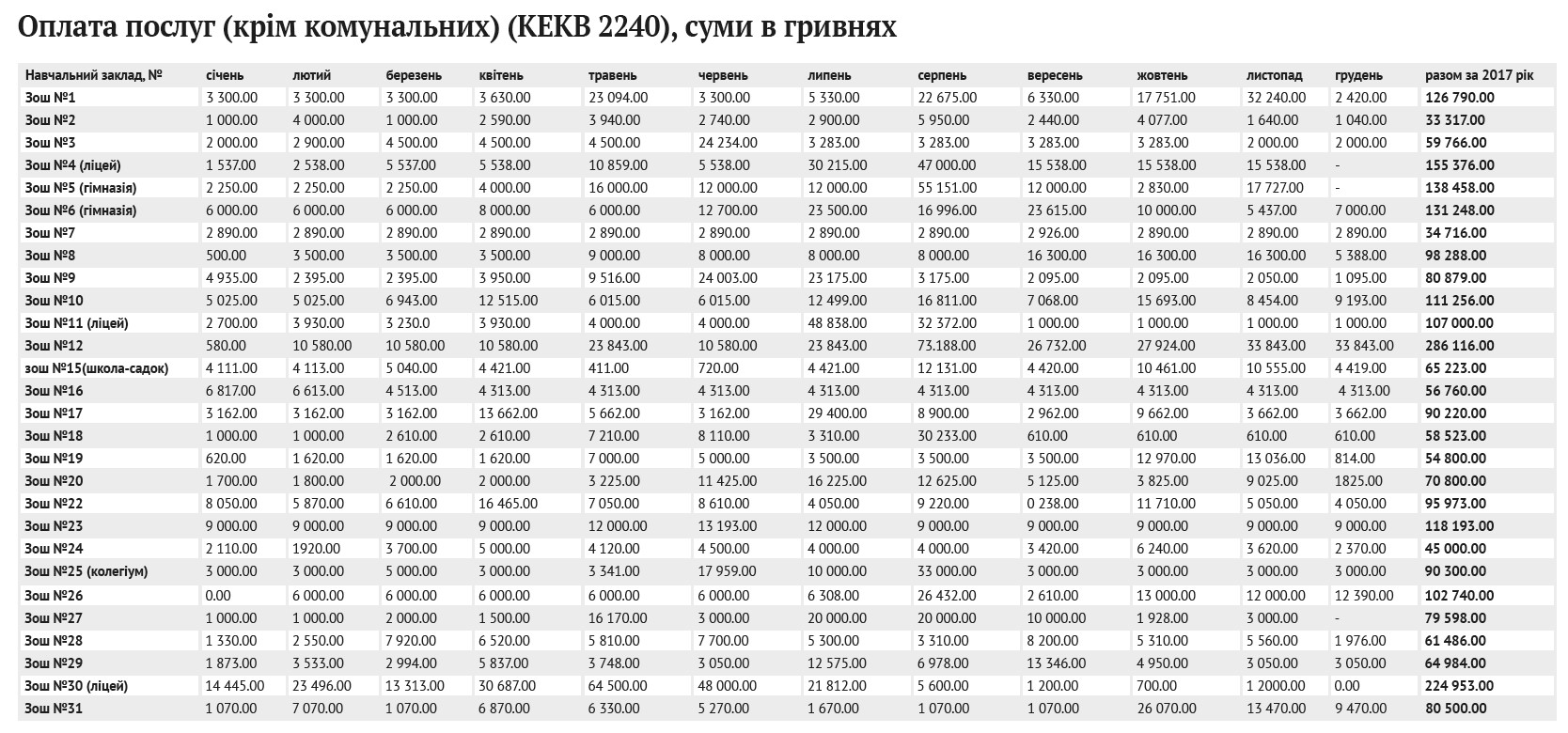У попередньому номері «ТелеграфЪ» друкував зведену таблицю для шкіл за статтею «Предмети, матеріали, обладнання та інвентар…». Наразі пропонуємо читачам зведену таблицю для шкіл за статтею «Оплата послуг (крім комунальних)». Таблиця складена за інформацією, наданою міським департаментом освіти. У ній ви можете побачити, скільки додаткових коштів на оплату послуг помісячно виділили школі, де вчиться ваша дитина.
