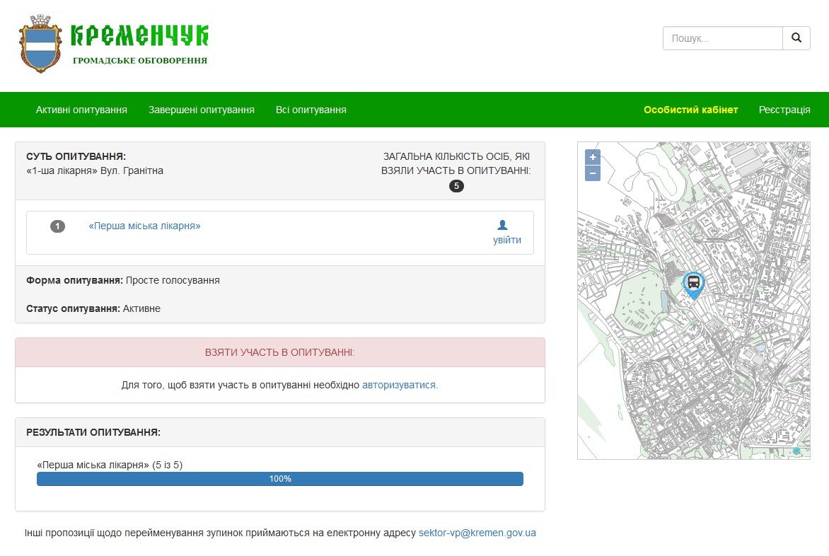 «1-шій лікарні» по вул. Гранітна 5 із 5 кременчужан обрали назву «Перша міська лікарня». Воно й не дивно, адже це єдиний запропонований варіант.