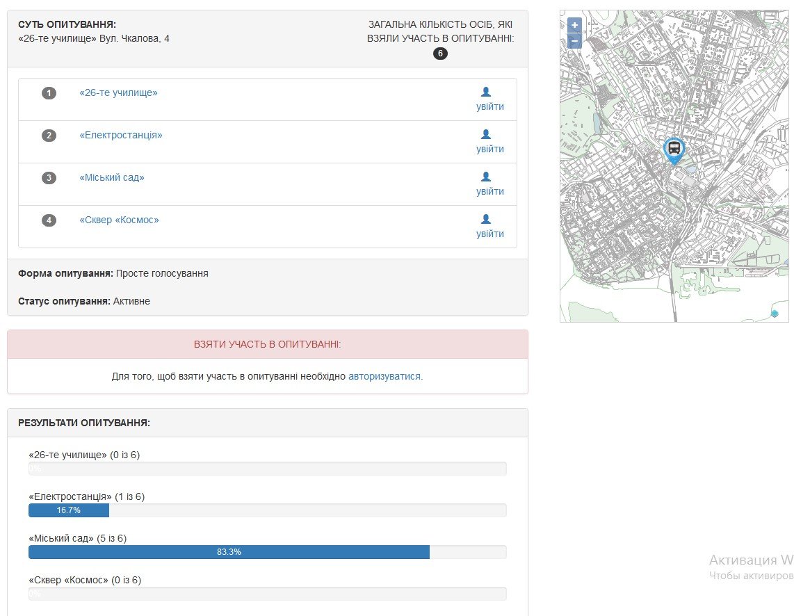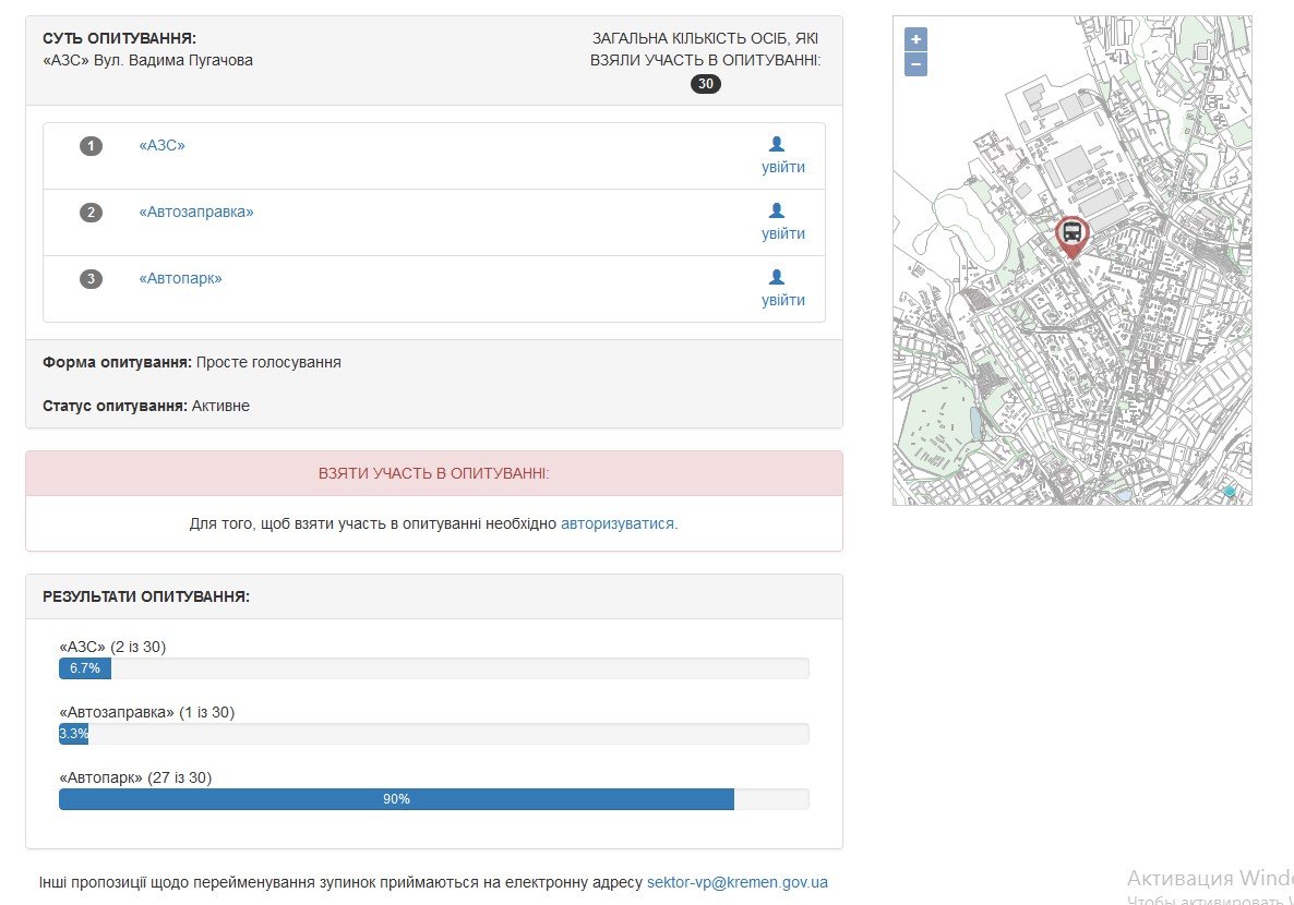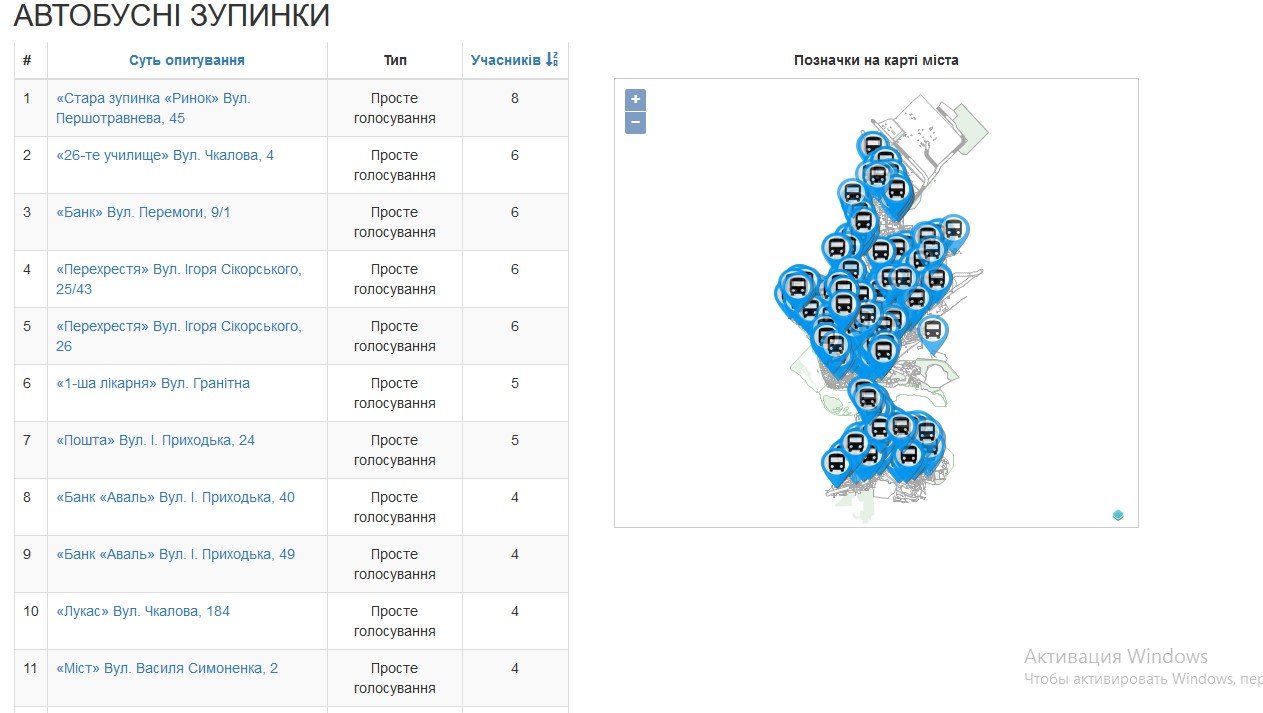 З автобусними зупинками та зупинками маршруток ситуація іще гірша. Таких зупинок у місті 299. Кременчужан вистачило всього на 83, та й то, це ті зупинки, за які проголосувала хоча б одна людина.