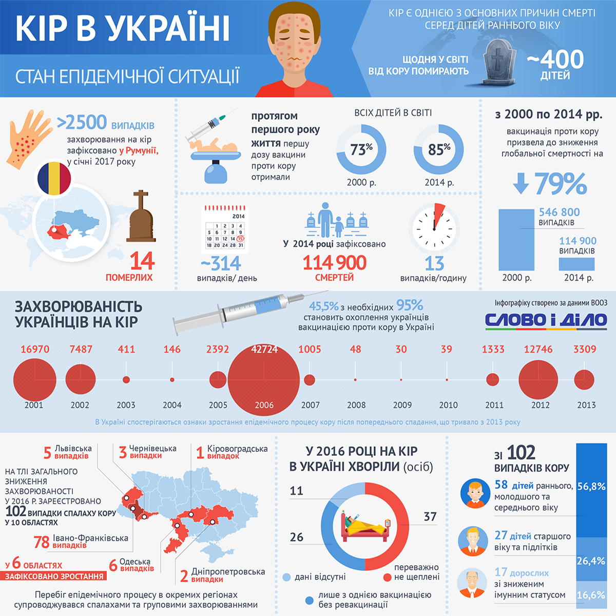 - В Румынии вспышка заболеваемости кори, сейчас около 2,5 тысяч заболевших. Из них 1% умерли. Единственная защита — вакцинация. В Украине зафиксировано 60 случаев кори в Ивано-Франковской области. Во Львове, Виннице и Тернополе — единичные случаи. Опасность в том, что многие едут туда отдыхать.