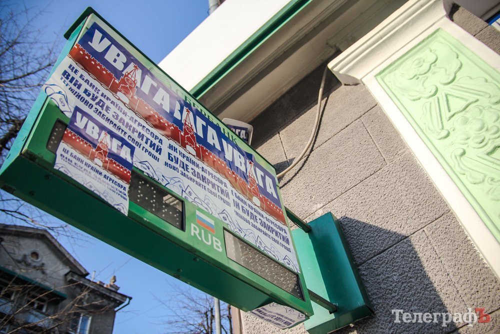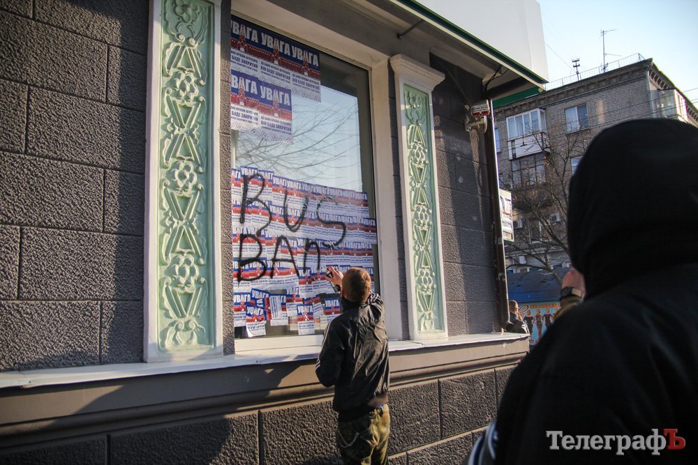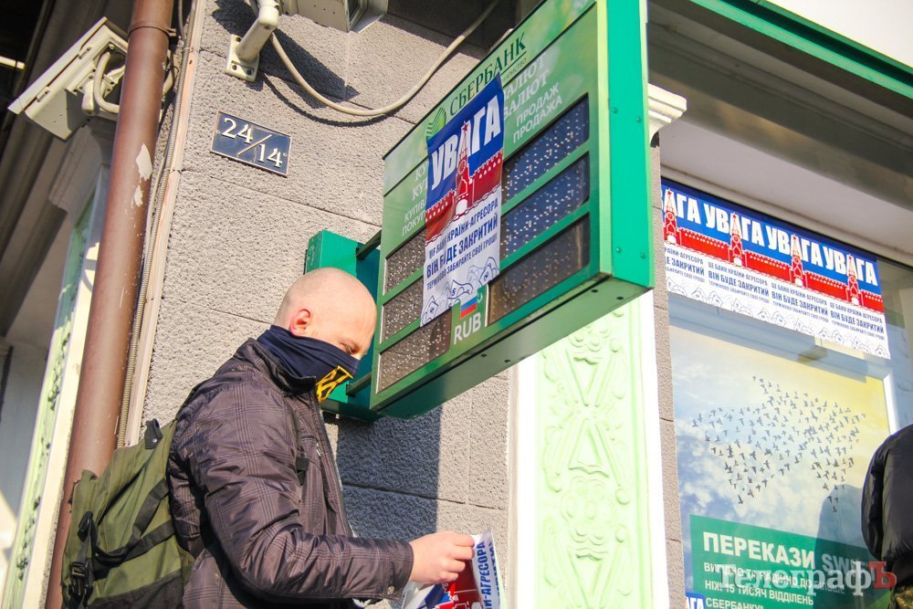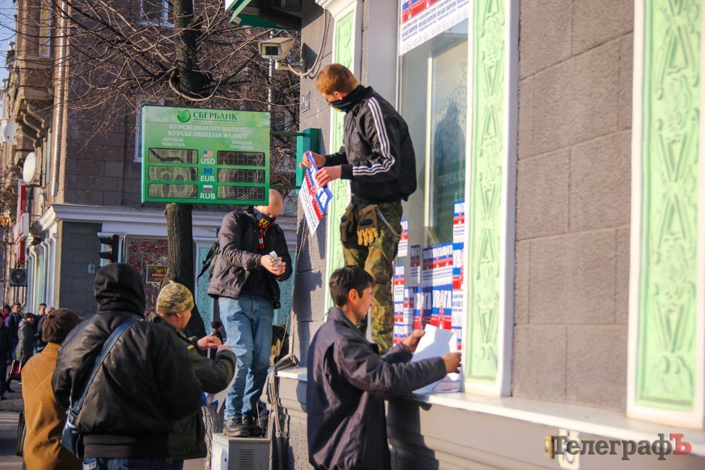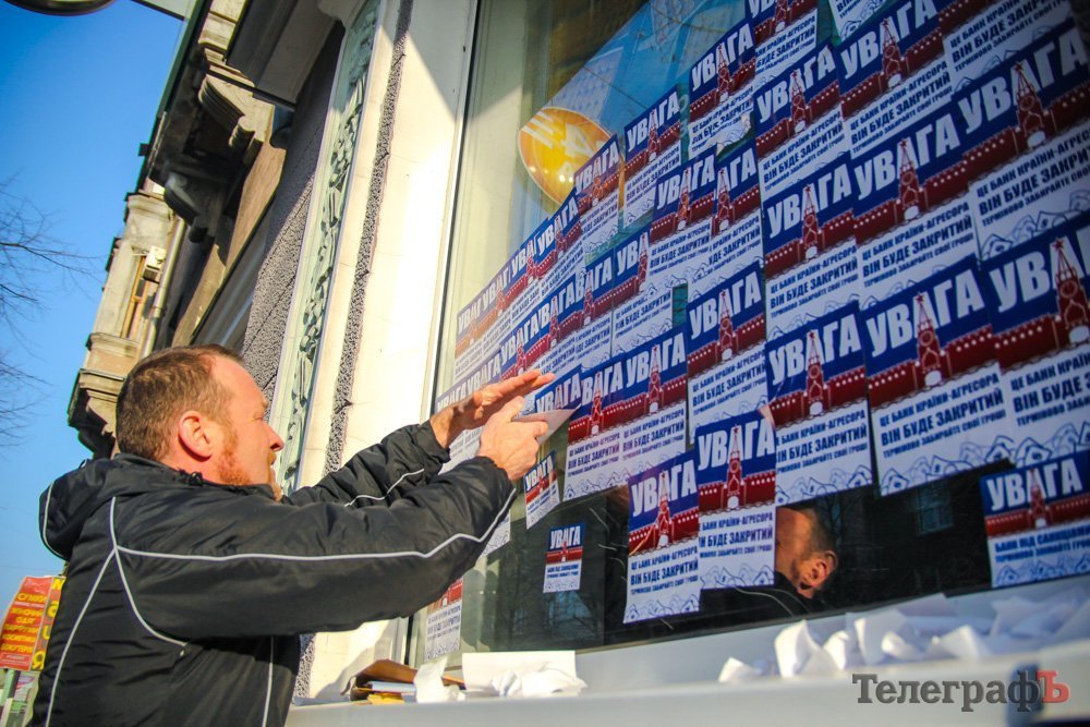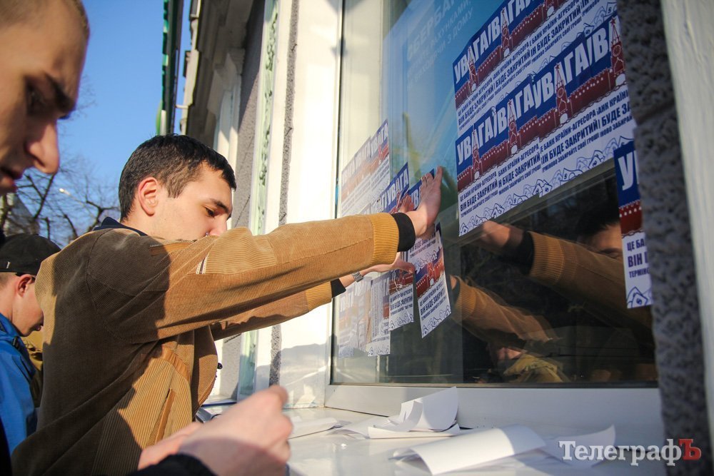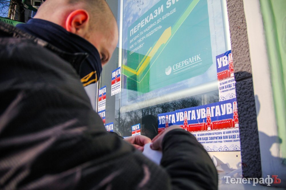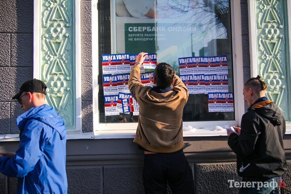 В Кременчуге активисты обклеили окна Сбербанка сообщениями.