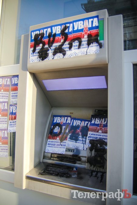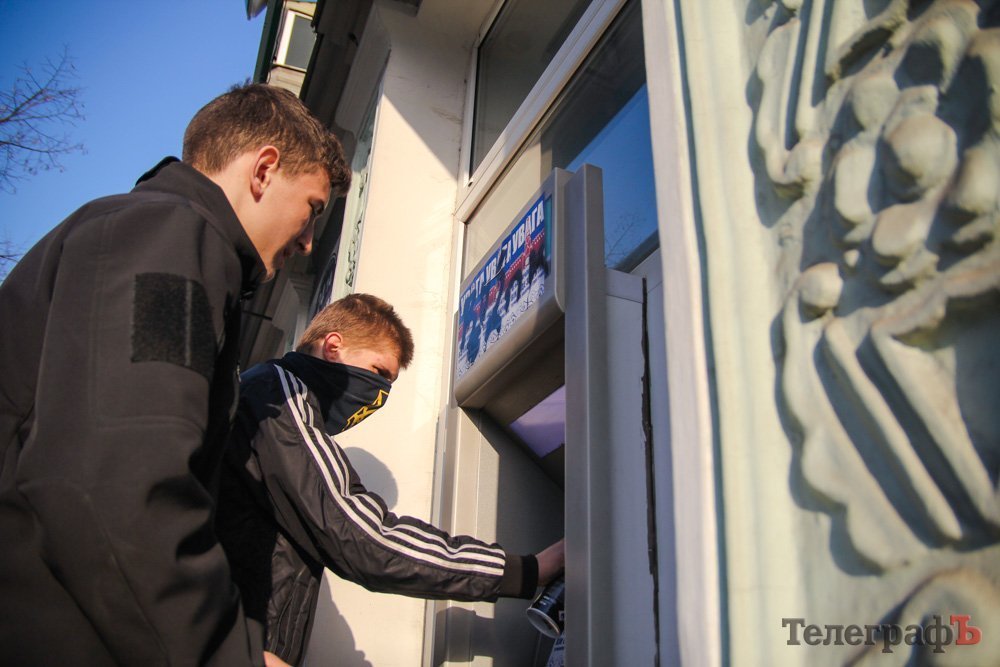 Помимо наклеек на стеклах, активисты залили краской банкомат. Турист-иностранец, подойдя к нему так и не смог снять деньги.