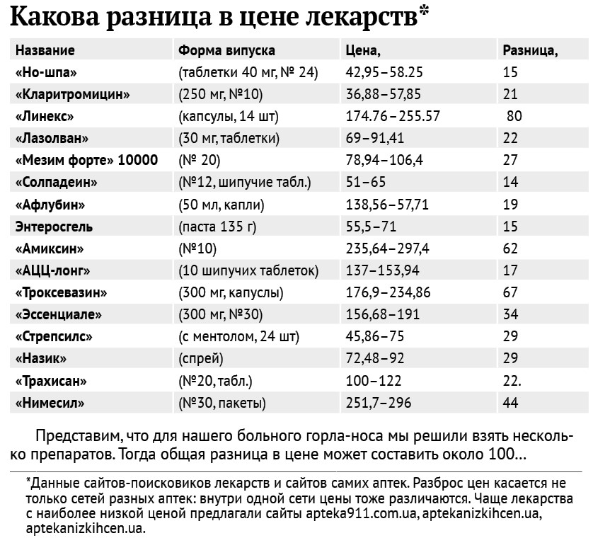 Будьте готовы к тому, что в аптеках одной и той же сети стоимость лекарств отличается. Иногда разница – 3 грн, но встречается и 20 грн… Например, лекарство для горла в аптеке в центре стоит 100 грн, но в точно такой же аптеке на Раковке – 122…