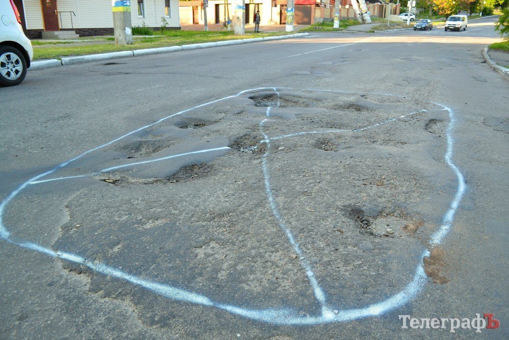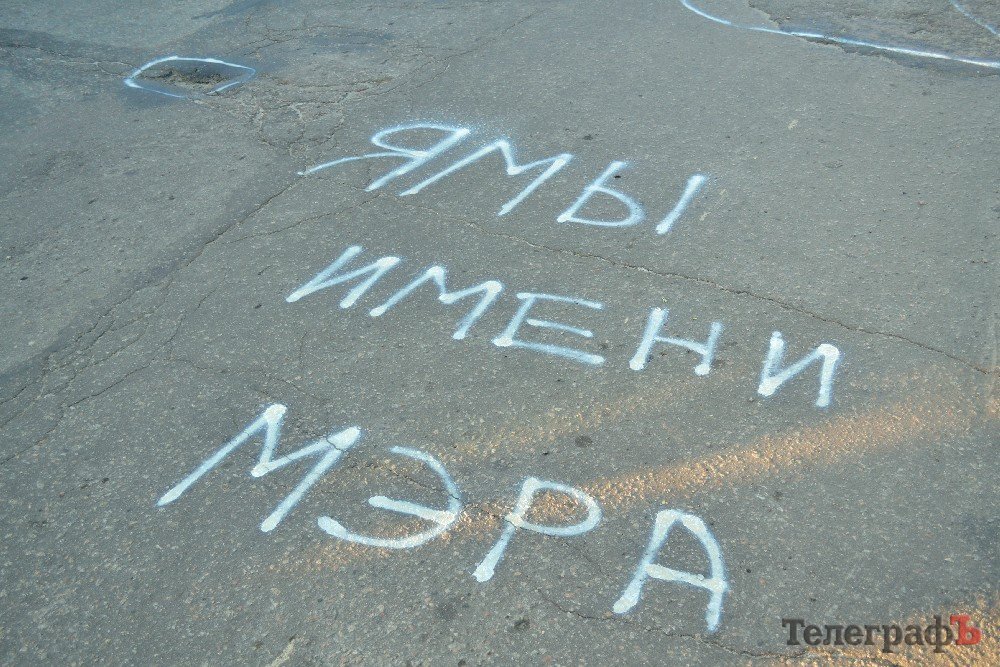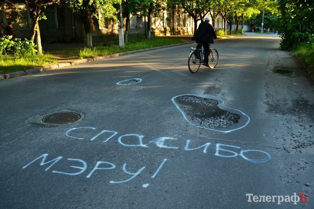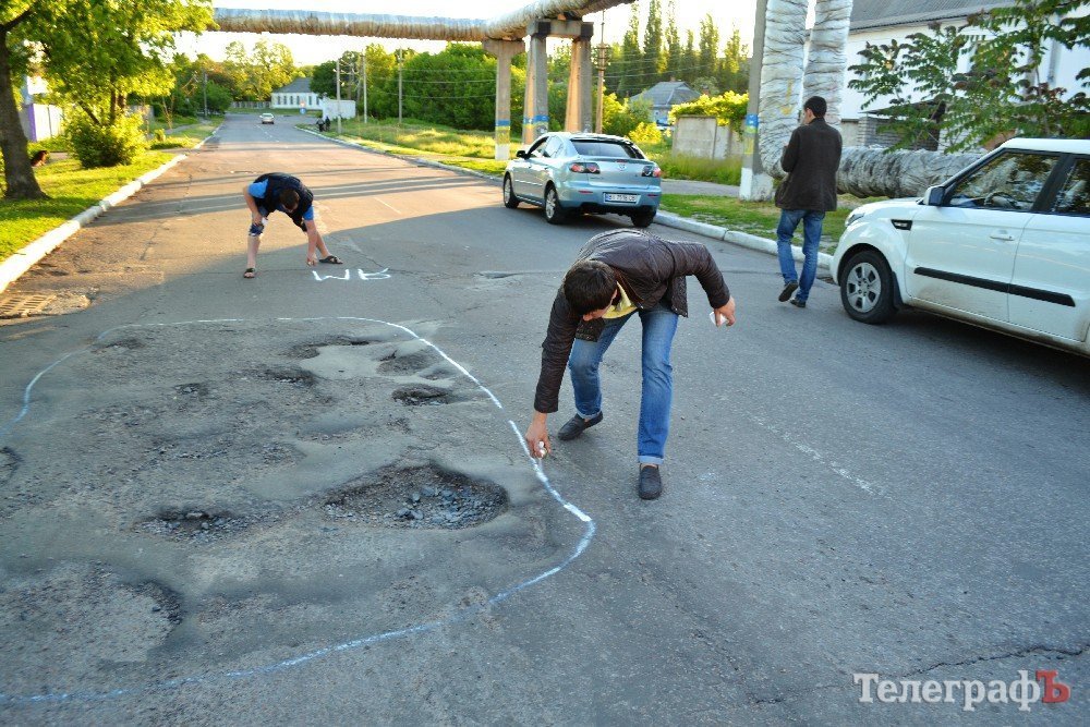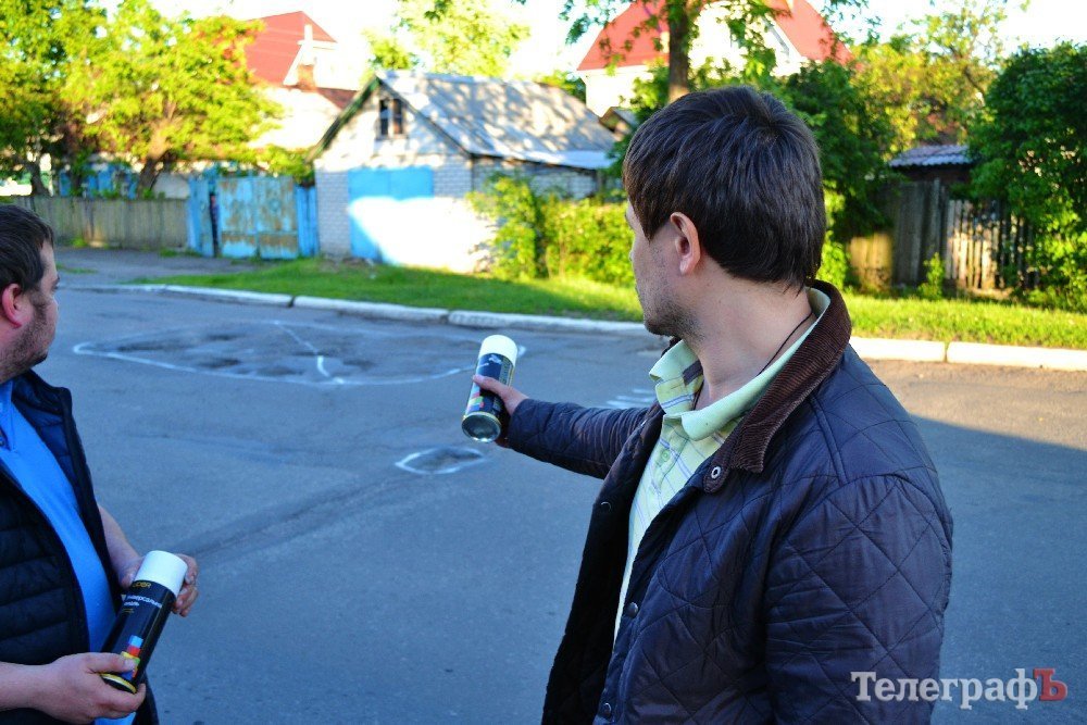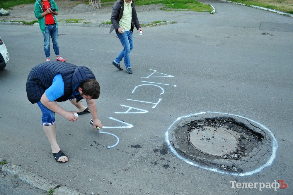 Вечером 22 мая кременчугские автомобилисты из сообщества взаимопомощи на дорогах Drive Help Kremen провели акцию на ул. Чкалова и Европейской – пометили ямы белой краская, а некоторым присвоили имя мэра.