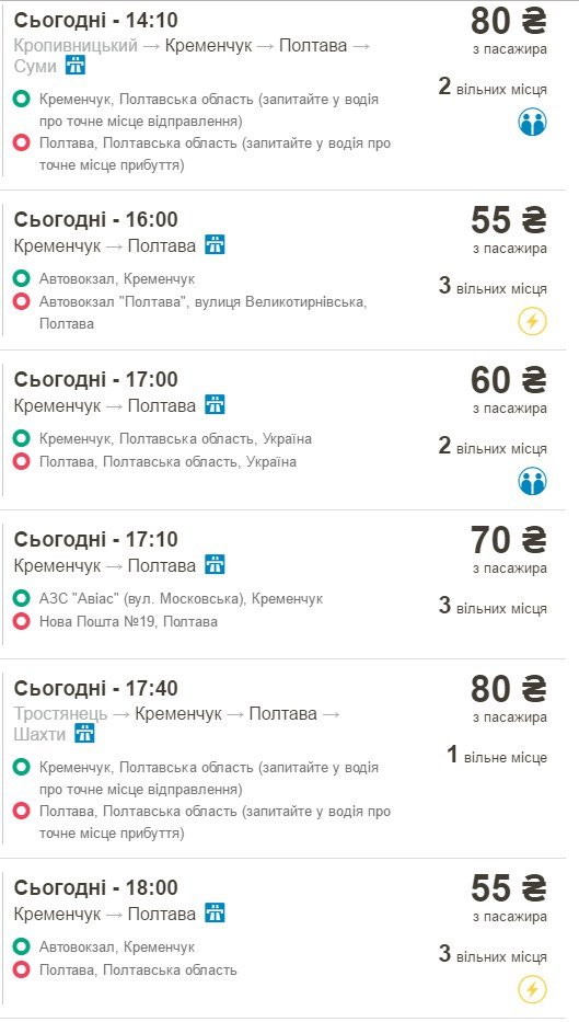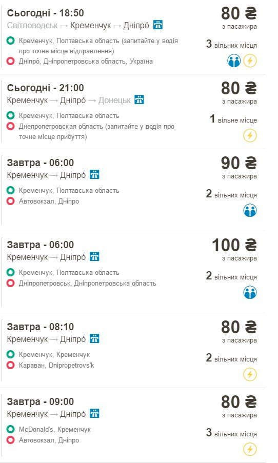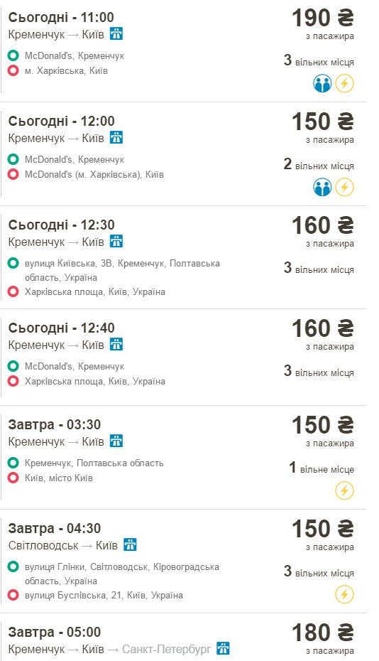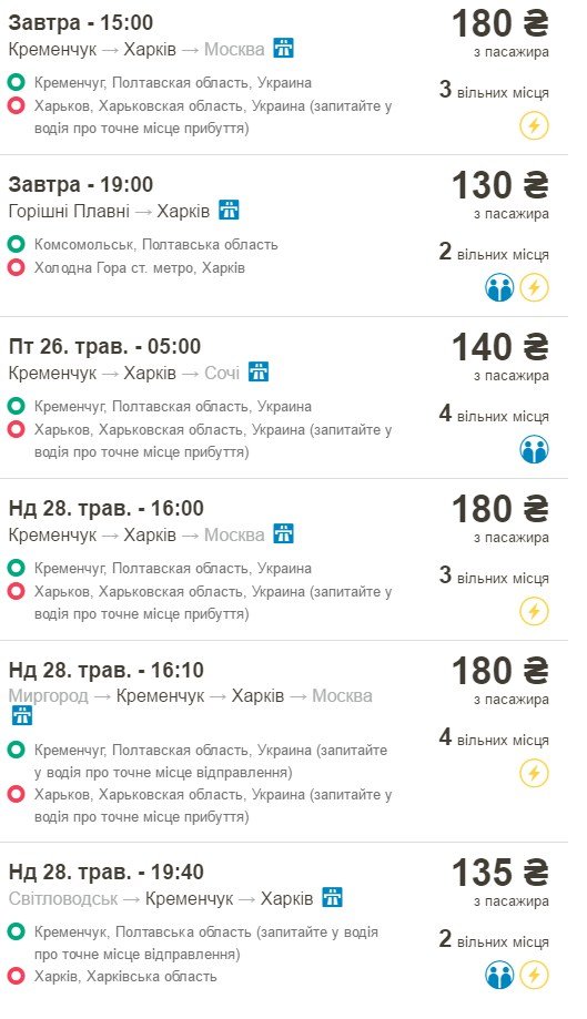 Для сравнения, поездки в Киев, Харьков, Днепр и Полтаву на сервисе "blablacar":