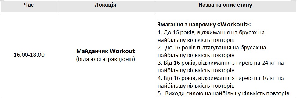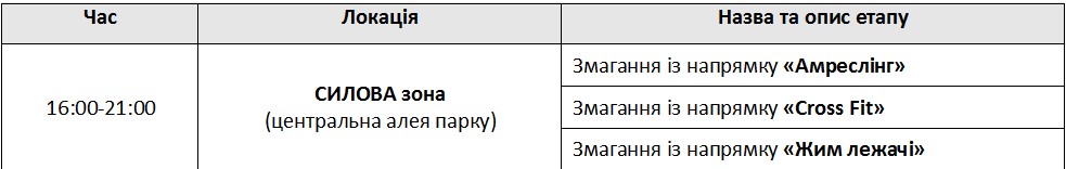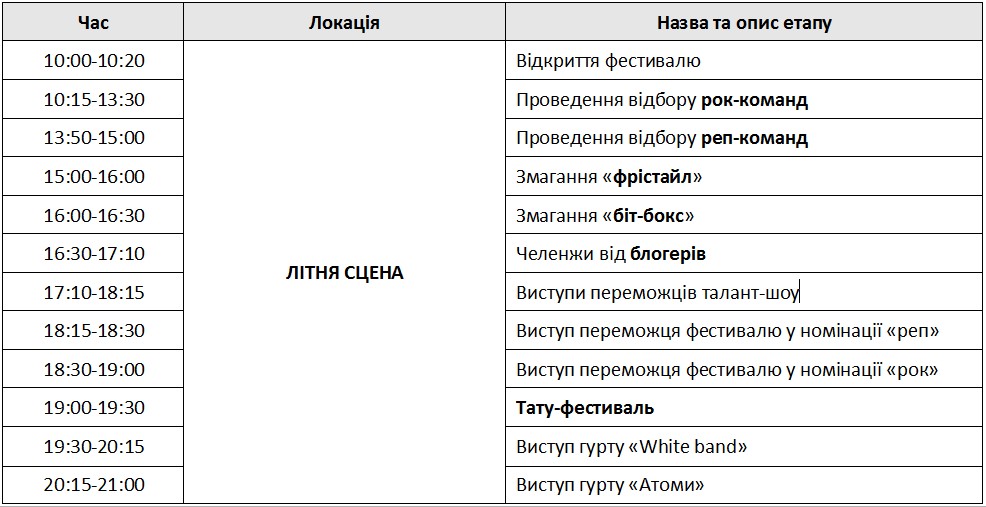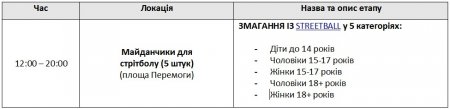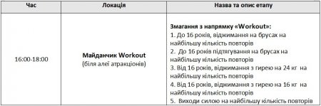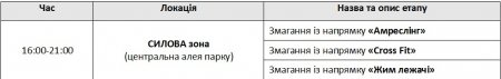 рок, рэп, граффити, уличный баскетбол, уличный футбол, фристайл, Roller skating, Games of skate, ВМХ, велотриал, Freestyle, Dj, Street Workout, трикинг, Бит-бокс, амреслинг, жим лежа, пляжный волейбол. Впервые в рамках фестиваля будут проводиться соревнования по лазертагу. Все желающие смогут попробовать себя в городках и алтимат (фризби).