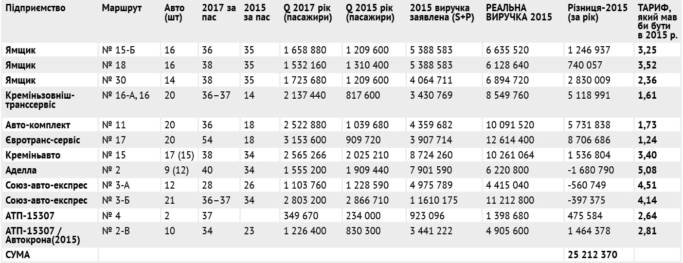 «Непозбувна бентега» таки переслідувала нас недарма! Подивіться останні стовпчики в таблиці. Отже, кременчужани за рік переплатили 25,2 млн грн перевізникам на 14-ти маршрутах! І все це завдяки тому, що перевізники «приховали» кількість пасажирів та виручку від своїх послуг.