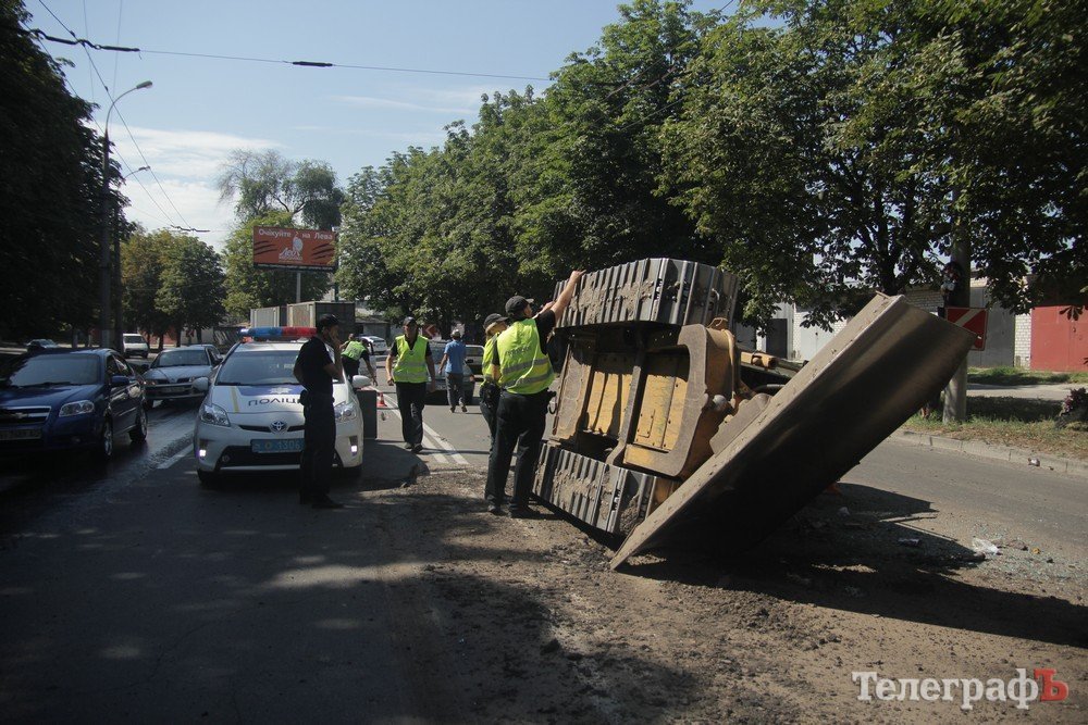 Как сообщили в пресс-службе патрульной полиции Кременчуга, бульдозер упал с тягача, на котором его перевозили.