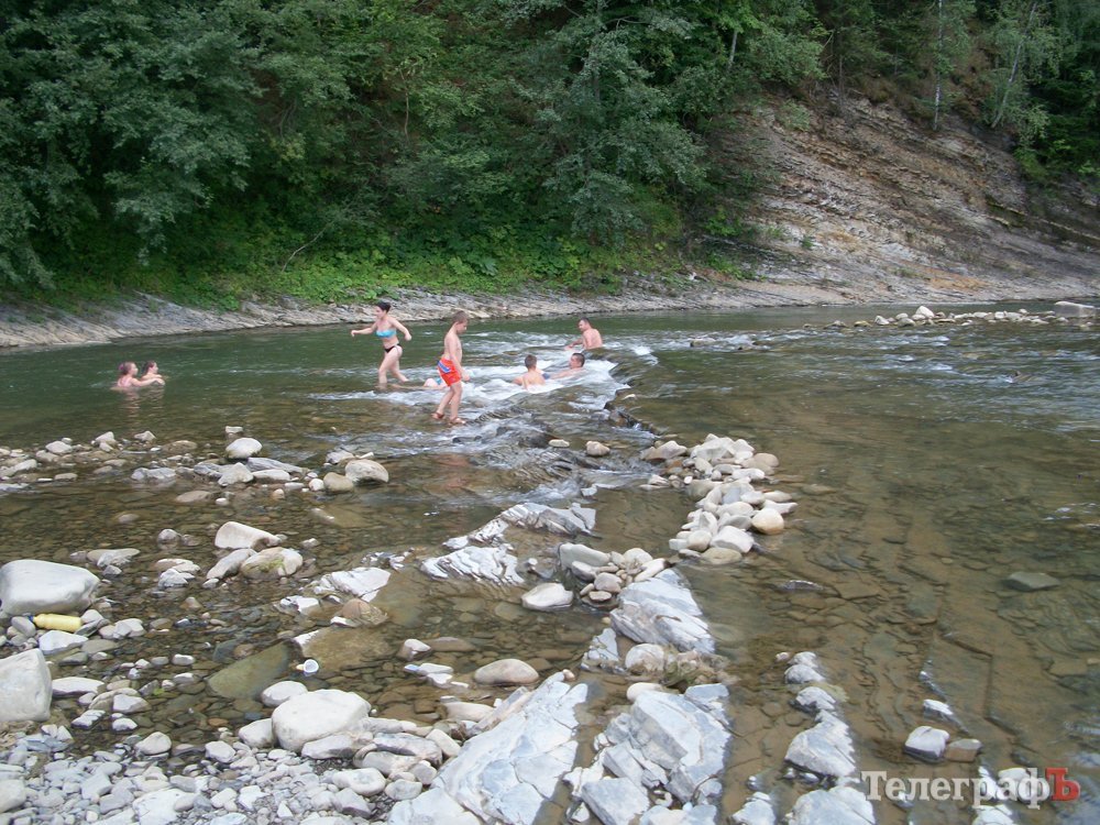 До речки, которая течет вдоль города, из любой его точки не более 10 минут ходу. Есть и неглубокие места для любителей просто помочить ножки. И места поглубже, чтобы прыгнуть со скалы. И карпатское джакузи. Кстати, самое отличное из всех, что попадалось: просто ванна посреди реки. Вода чистейшая. Кайф! Но людей вокруг… Мух меньше. На берегах реки, возле озерка, за озерком, на лужайках, в леску – шашлыки и палатки.
