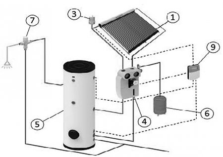 Вакуумного коллектора (1), воздухоотводчика (3), одноконтурной солнечной станции с регулятором и насосом (4), бака-накопителя (5), расширительного бака для гелиосистемы (6), термостатического смесителя (7), жидкости для системы (10), контроллера (9), а также комплекта креплений и соединителя коллекторов (2, 8).