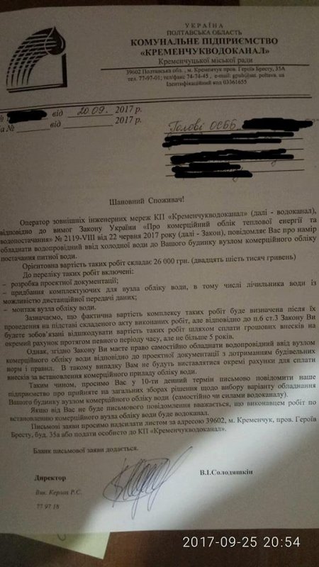 Кременчужани у соцмережах активно обговорюють новацію «Кременчукводоканала». Цього тижня мешканці приватних будинків та мешканці ОСББ почали отримувати «листи щастя». Мешканцям приватного сектору пишуть, що водоканал має «намір провести реконструкцію системи водопостачання вашого домоволодіння»: встановити комерційний вузол обліку води на групу будинків.