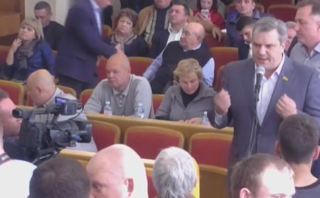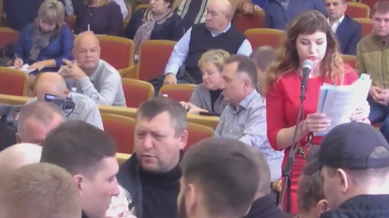 22.20. Выступает активист Харченко. Говорит о работе сессии. В это время Коновалова и Трофименко суют мэры какие-то бумаги.