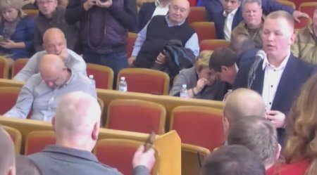 Активистов просят отойти от президиума. В центре событий находятся руководители городской полиции. Слышна нецензурная брань. Сотрудников муниципальной полиции обвиняют в том, что они «продались за зарплату».
