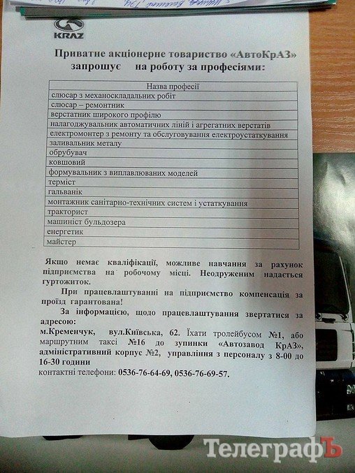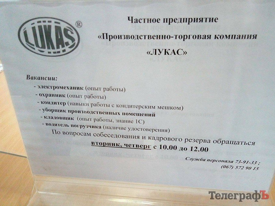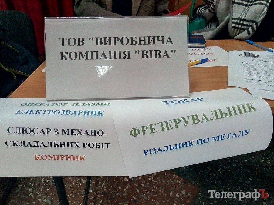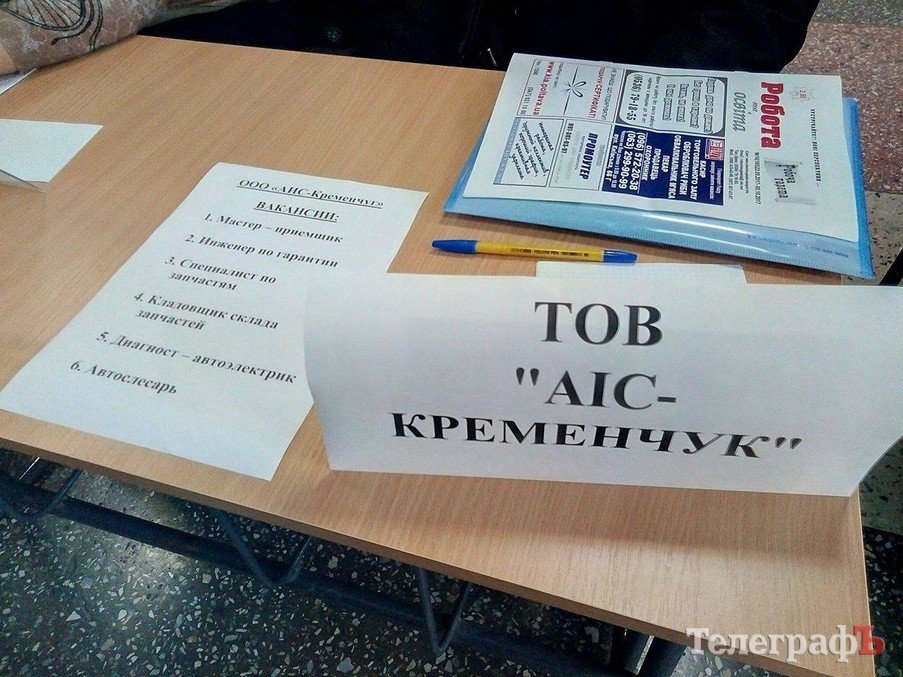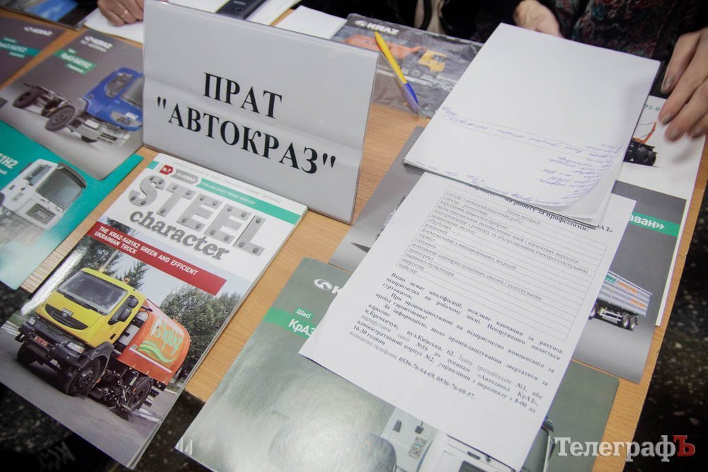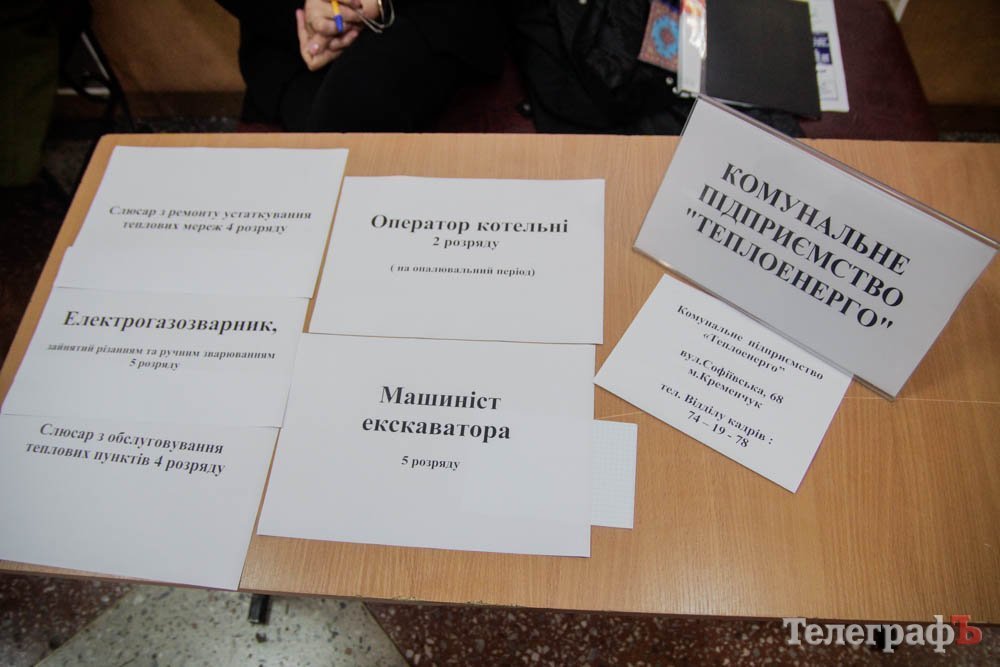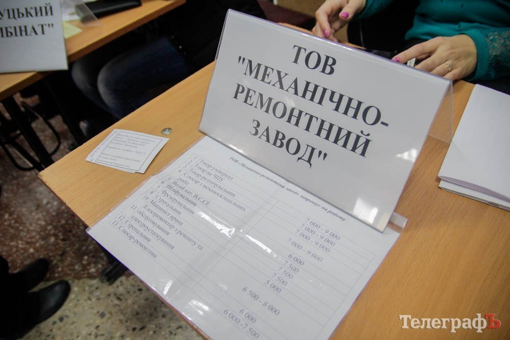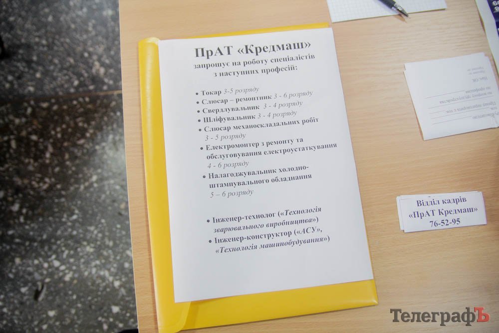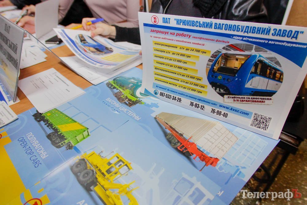 18 октября в ДК «Кредмаш» прошла ярмарка вакансий: предприятия предлагали кременчужанам работу. По данным Кременчугского горрайонного Центра занятости, участие приняло около 20 предприятий. Среди них: КВСЗ, «АвтоКрАЗ», «Кредмаш», «Укртатнафта», «Кременчугский сталелитейный завод», «Лукас», «Полтаваоблэнерго», «Кремтекс», «Изумруд», Комбинат ритуальных услуг и другие.