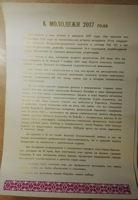 Это письмо к вам, юноши и девушки 2017 года. Мы приняли его 29 сентября 1979 года на торжественной встрече ветеранов 39-го гвардейского Венского Воздушно-десантного корпуса в составе 100, 107 и 114 воздушно-десантных дивизий, посвященной 36-й годовщине освобождения города Кременчуга от немецко-фашистских захватчиков.