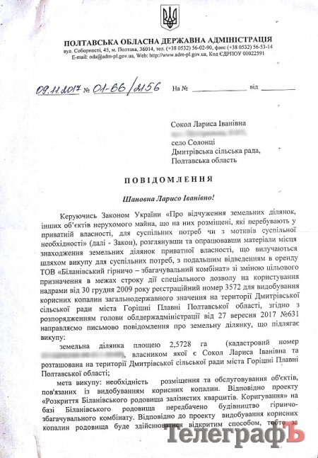 И лишь 23-го ноября – через два месяца после появления распоряжения №631 – Лариса Сокол получила письменное уведомление от Полтавской обладминистрации. Ей сообщали о планируемом выкупе её земельного пая (2,5 га) для добычи полезных ископаемых открытым способом Белановским горно-обогатительным комбинатом.