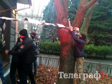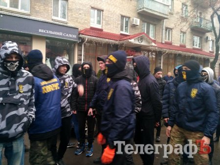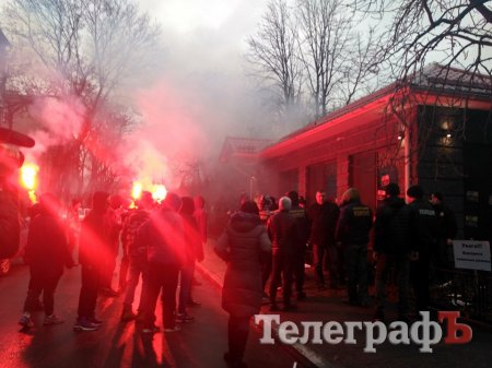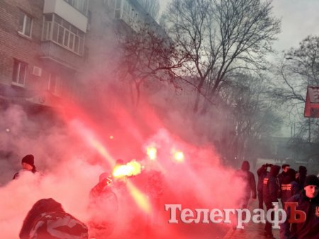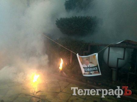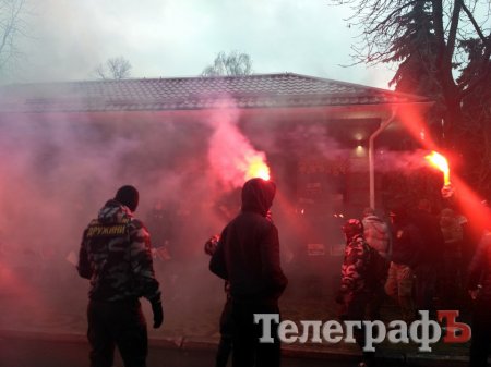Представники ГО "Національний корпус "Азов" обвішали фасад будинку зображеннями екс-керівника податкової Кременчука Звонкова та голови земельної комісії Руслана Ульянова, а також палили фаєра.