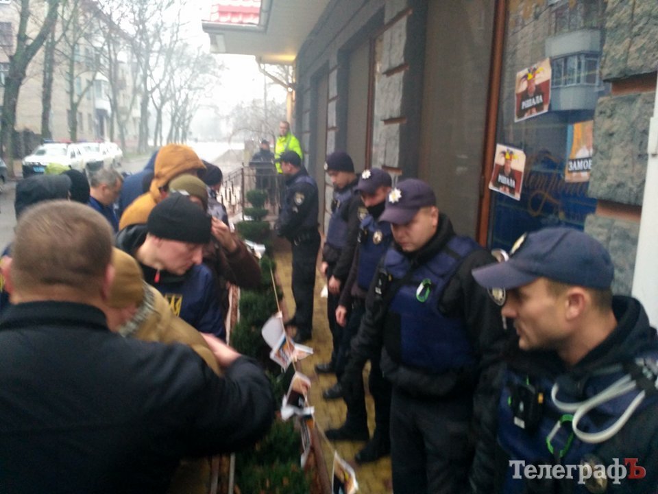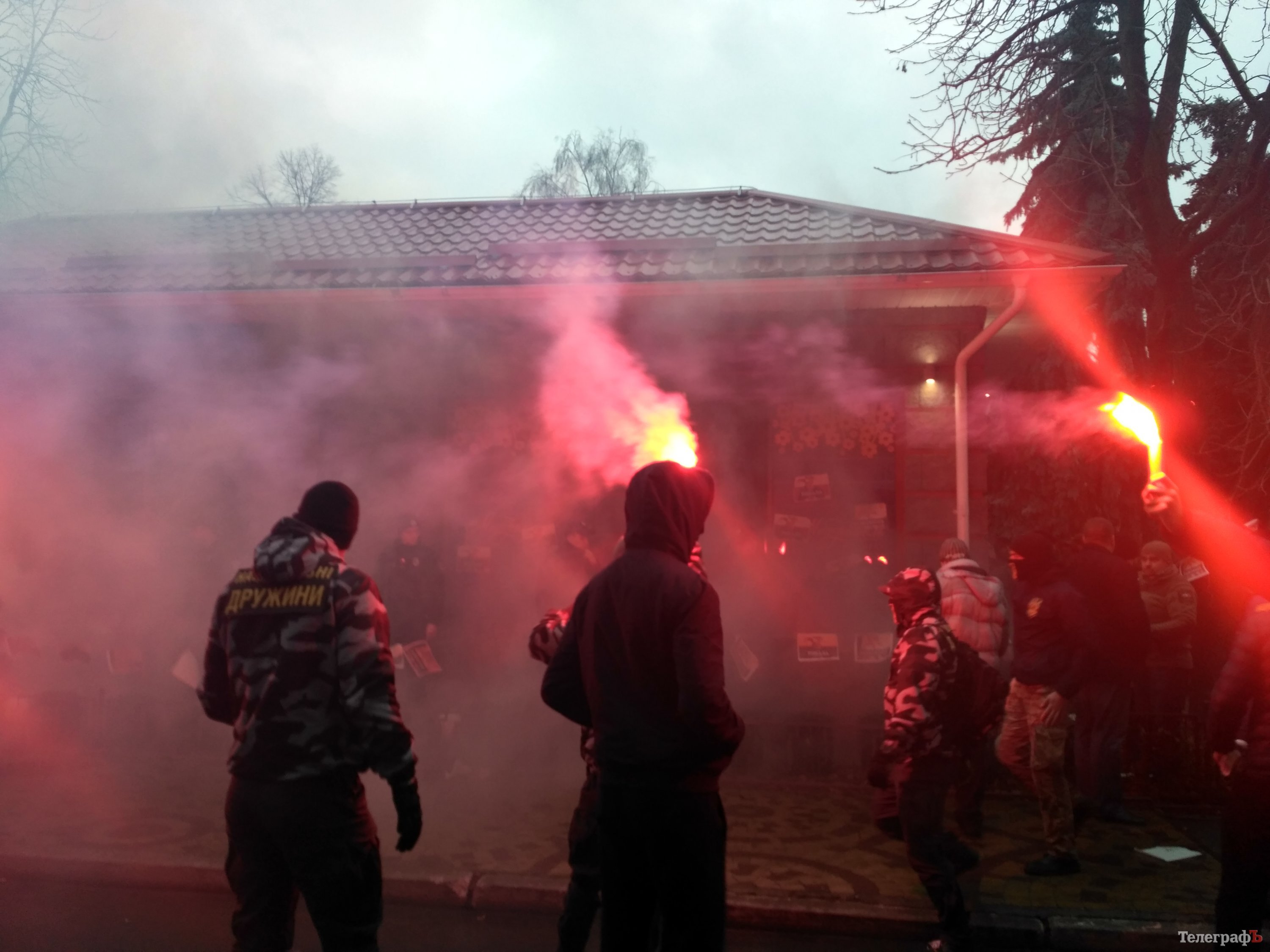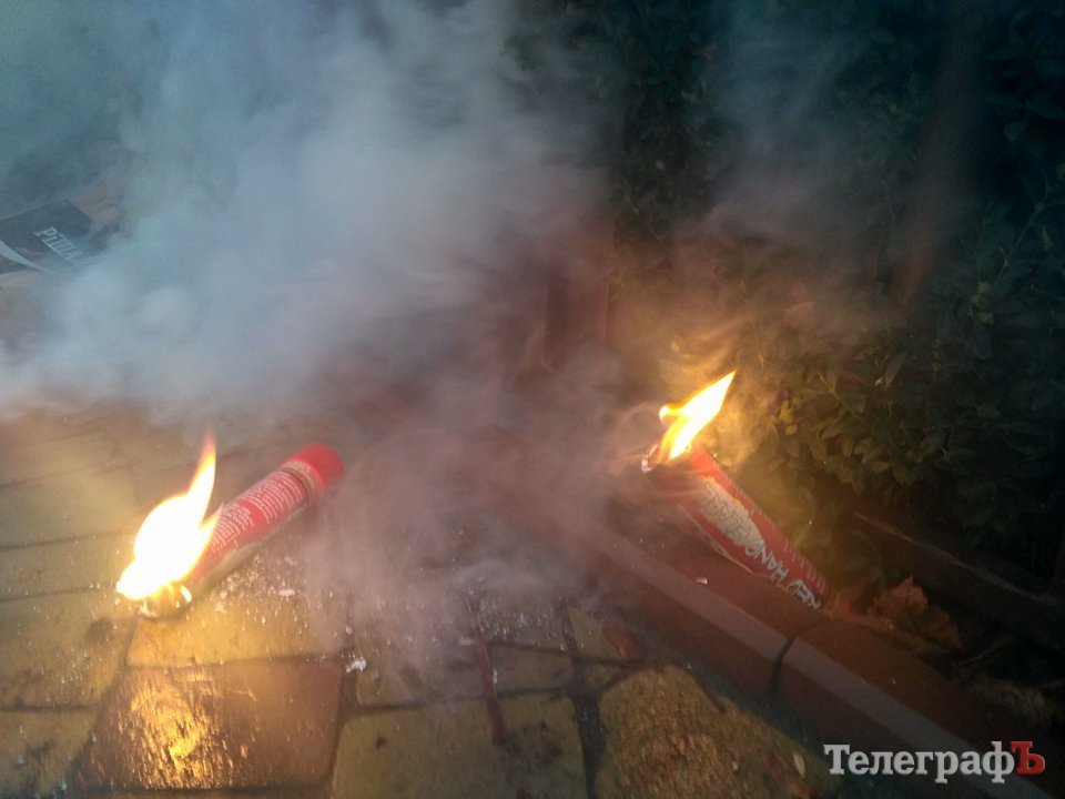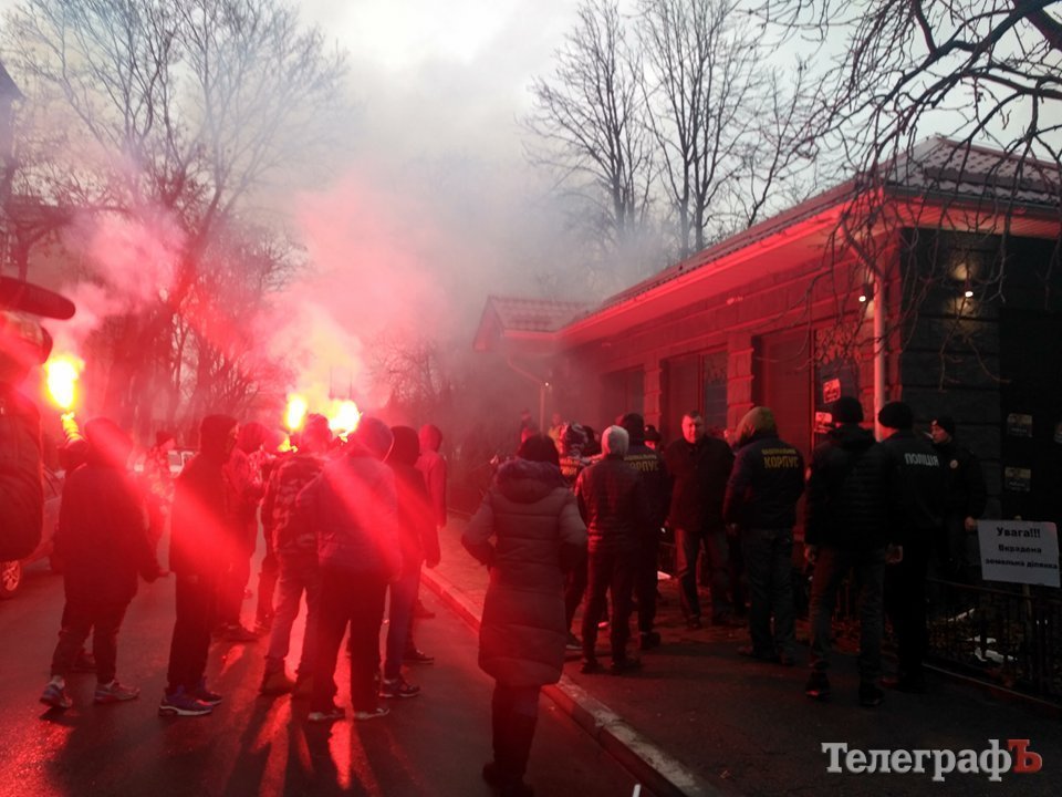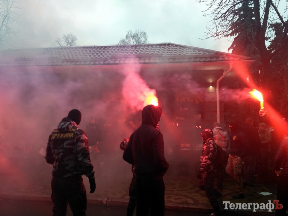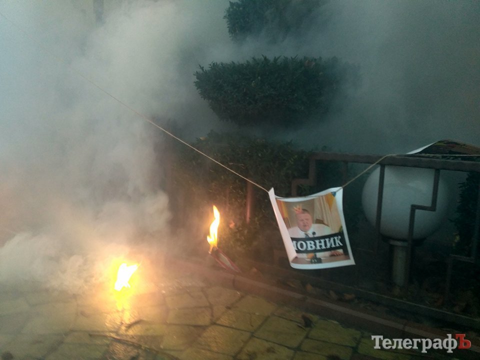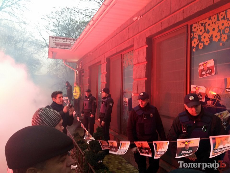 Представники ГО «Національний корпус «Азов» обвішали фасад будинку зображеннями екс-керівника податкової Кременчука Звонкова та голови земельної комісії Руслана Ульянова, а також палили фаєра.