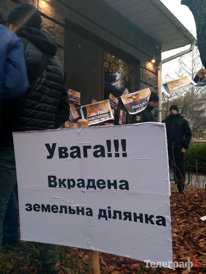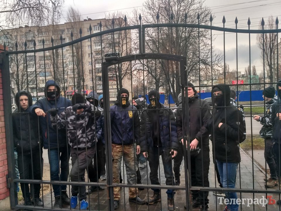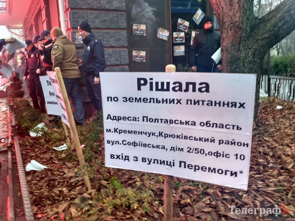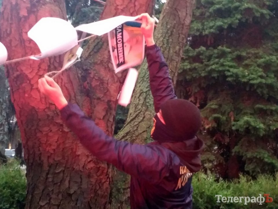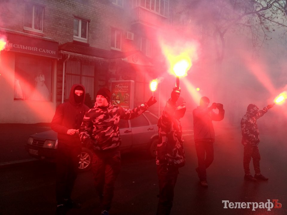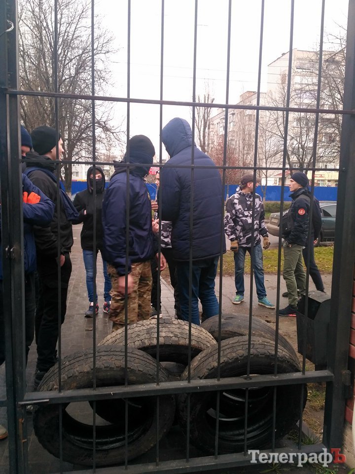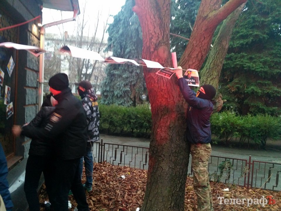 Представники ГО «Національний корпус «Азов» обвішали фасад будинку зображеннями екс-керівника податкової Кременчука Звонкова та голови земельної комісії Руслана Ульянова, а також палили фаєра.