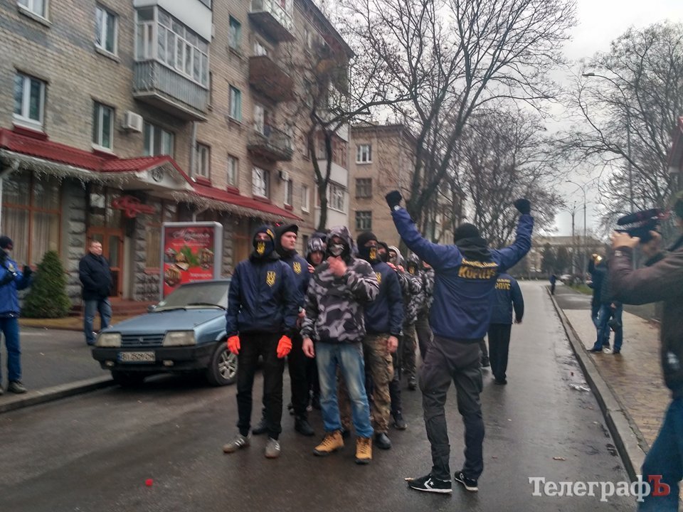 Після того, як протестуючі покинули місце, залишилося двоє «азовців», між ними та поліцією зав’язалася сутичка. На підмогу кинулися протестувальники, які намагались «відбити свого», якого правоохоронці намагались затримати. Зав’язалася сутичка, поліція застосувала сльозогінний газ.