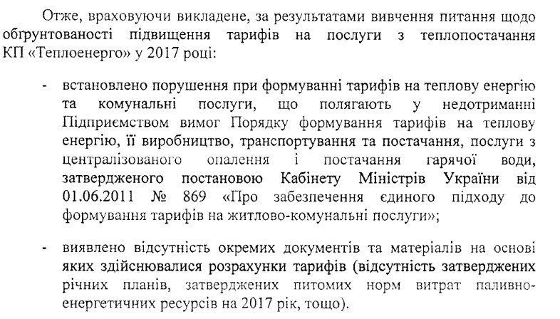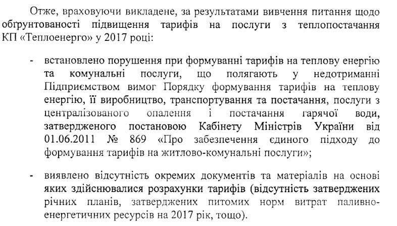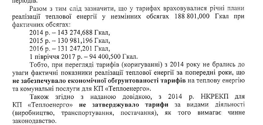 Крім того, у документі зазначено, що з 2014 року НКРЕКП не затверджувало підприємству «Теплоенерго» тарифи за ліцензованими видами діяльності (окремо на виробництво транспортування та постачання), як того вимагає чинне законодавство. Тобто апріорі тарифи вже кілька років розраховувалися з порушенням порядку їх формування.