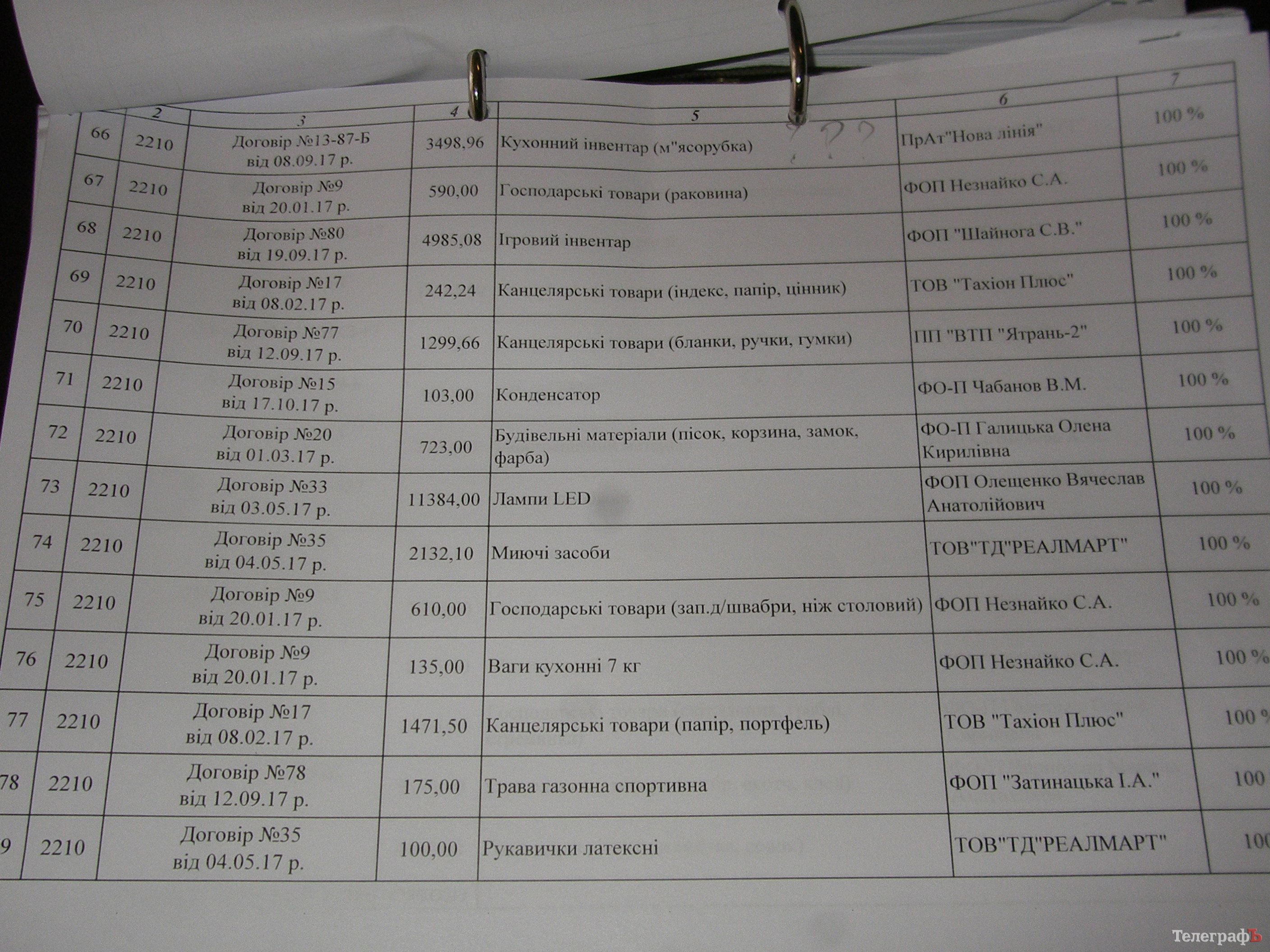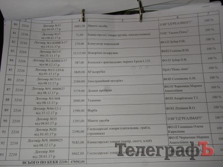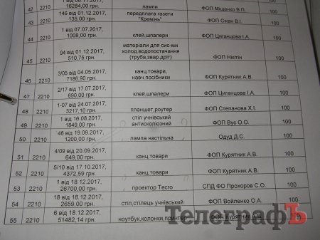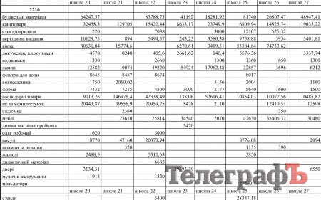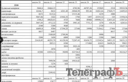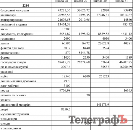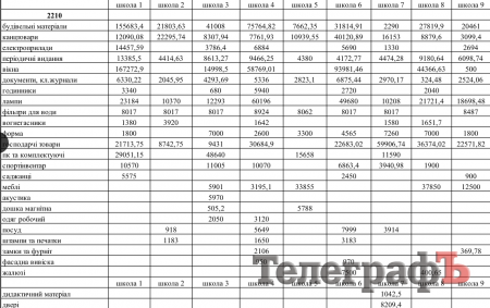 Дійсно, у графі “документи, класні журнали” впадає в очі велика різниця між сумами, витраченими школами на придбання цих предметів. Звісно, кількість закуплених класних журналів залежить від кількості учнів у школі. Та й тут впадають в очі певні дива. Наприклад, маленька школа №2 закупила документів та класних журналів на 2045,95 грн, а теж маленька школа №24 купила документів та класних журналів лише на 140 гривень. Знову-таки, велика школа №1 придбала документів та класних журналів на 6330,22 грн, а не більша за неї школа-інтернат №21 купила тих же документів та класних журналів аж на 10 248 грн. Натомість ще одній великій школі №6 вистачило на це 6875,44 грн.