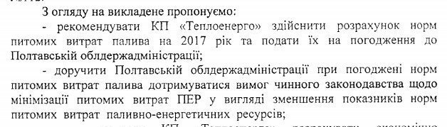 Ответ руководства «Теплоэнерго»: нормативные расходы топлива уже утвердила ОГА (документ не показали), и они не снижены. На «Теплоэнерго» поясняют это тем, что на котельных устаревшее оборудование, устаревшие сети, а также «винят» низкую калорийность газа. Однако, на сайте «Кременчуггаз» регулярно размещаются паспорта качества газа, как того требует закон. Отклонений в качестве газа не зафиксировано. По сути, заявления «Теплоэнерго» ничем документально не подтверждені.