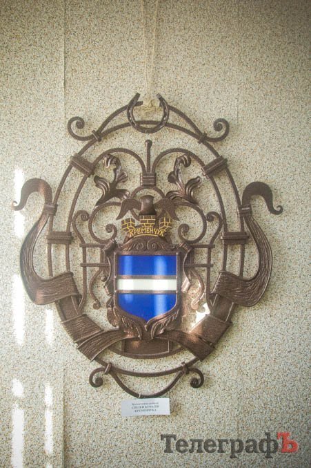 Головною прикрасою виставки «Народжено у вогні» є великий кований герб Кременчука – спільна робота ковалів: Евгена Кучеренка, Павла Лещенка, Віталія Стрижака, Олександра Шкурапета, Юрія Гаврильєва. Міський герб із синім тлом і стрічкою-Дніпром оповитий бароковими вензелями. Декор увінчаний підковою, мов чашою, що збирає сили й благодать для всіх містян. Бронзовий колір металевих елементів силуетно прочитується на світлому тлі й справляє враження легкої й ажурної мережки.