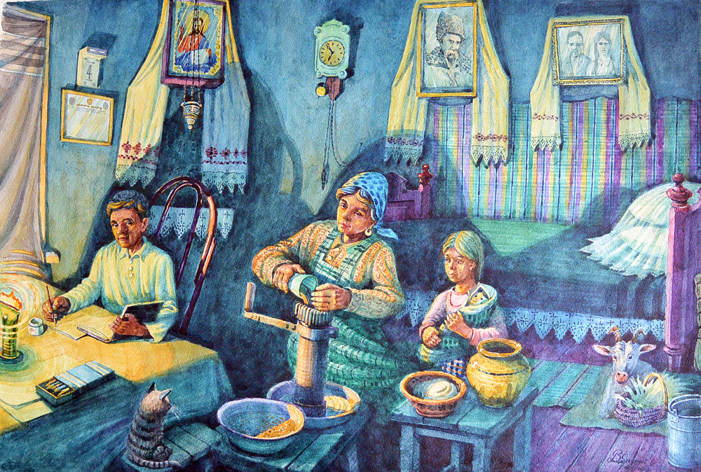 Як на мене, є ще один секрет успіху Володимира Дружка. Художник щиро любить усе, що малює. Просто не можу оминути таку душевну роботу-спогад про власне дитинство. На картині зображена сільська кімнатка, за столиком при керосинці готує уроки наш малий художник. Із хлопчиною поруч на столі лежать його перші малюнки й кольорові олівці. Мама перетирає на ручному млині зерно на крупу. Це складні повоєнні часи, а в хаті є місце затишку: подушечки прикриті мереживним покривальцем, на стіні в рушниках портрети Шевченка, дідуся та бабусі, сусідська дівчинка пестить ляльку, смугастий котик заглядає до людей, а в куточку гріється коза. Ця акварель не просто картина - це сокровенний куточок душі та спогадів художника. І він відкрито запрошує нас у свій світ любові і розуміння.