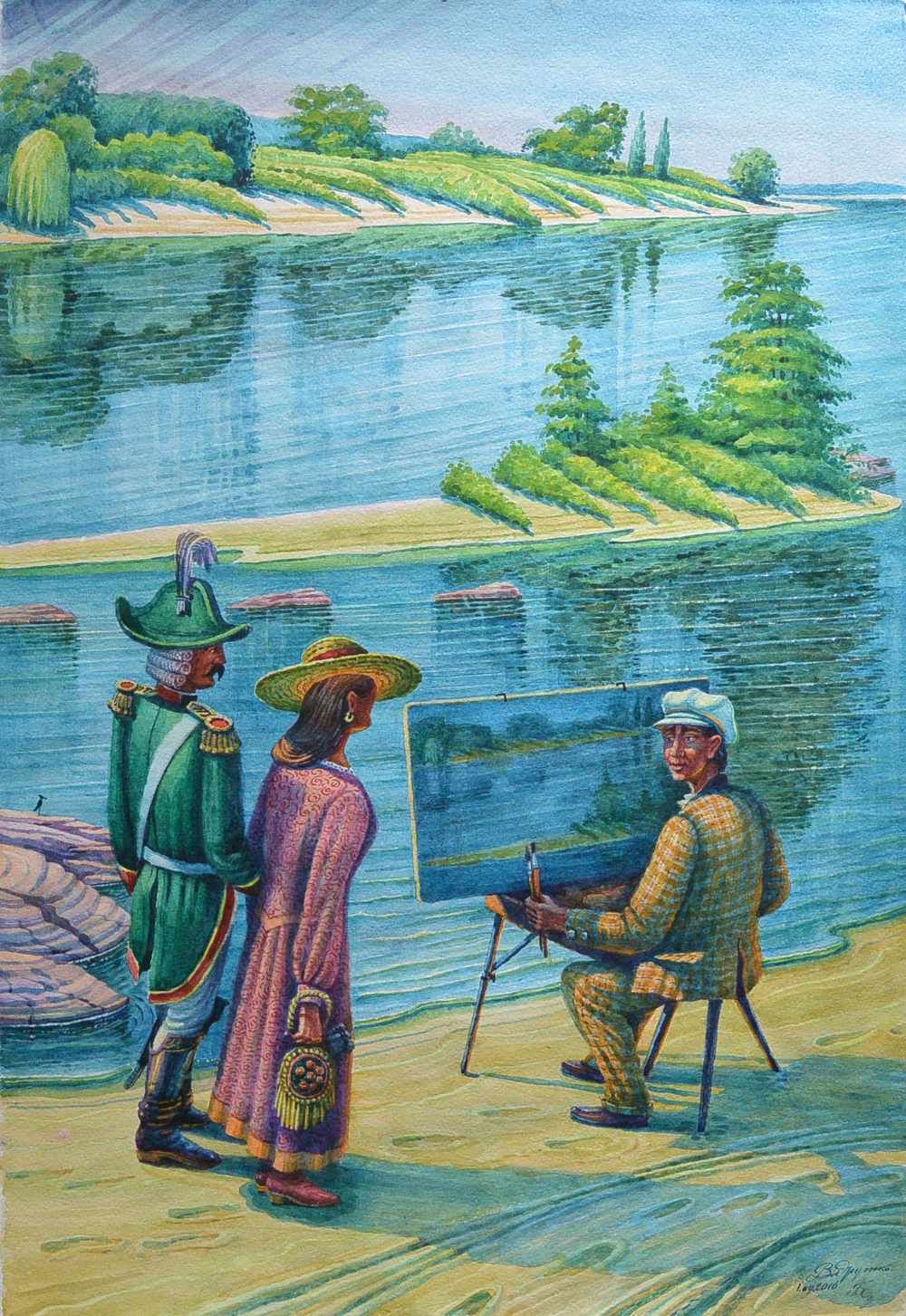 Уважний глядач помітить на виставці дві картини однакового сюжету, але виконані в різних техніках: простий олівець та акварель. Це не помилка, так Володимир Іванович розробляє будь-яку нову тему, а на виставці це сюжет про художника Боровиковського. Відомо, що талановитий і визнаний в усьому світі портретист Володимир Боровиковський був родом із Миргорода. Саме в Кременчуці сталася подія, що дала кар’єрний ріст митцю. Миргородський іконописець розписав Гостьовий будиночок для Катерини ІІ і тим так догодив, що був запрошений до Петербурга в Академію мистецтв. Дружко, знаючи про цей історичний факт, запропонував своє бачення: Боровиковський на пленері в Кременчуці. Юнак пише полотно з дніпровським краєвидом та островом Фантазія. Шановне панство, прогулюючись пляжем, цікавиться творчістю художника.