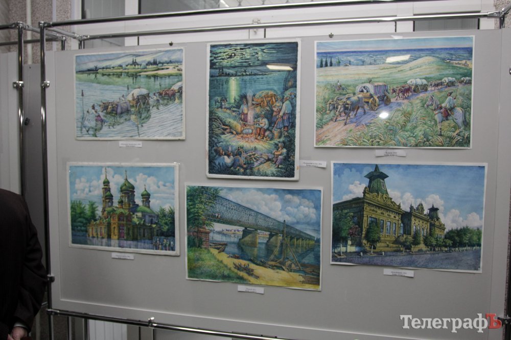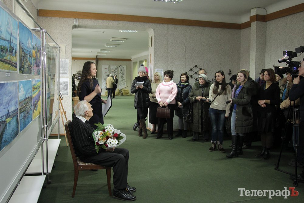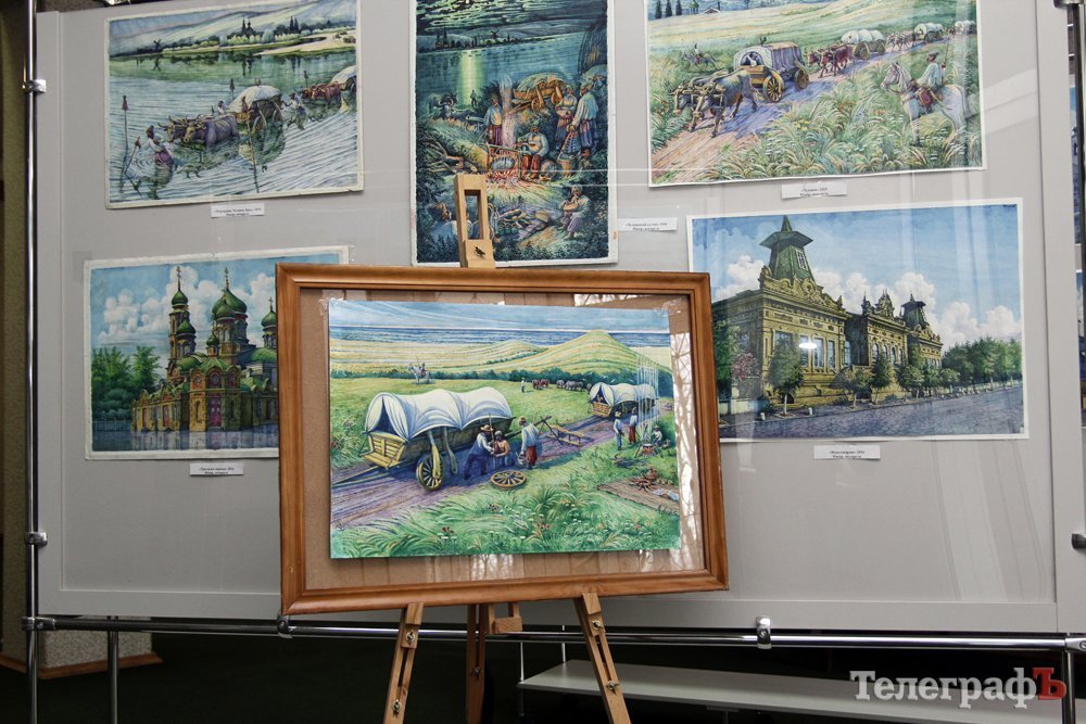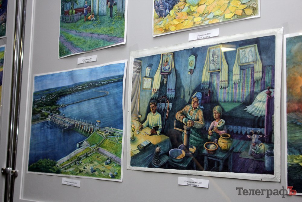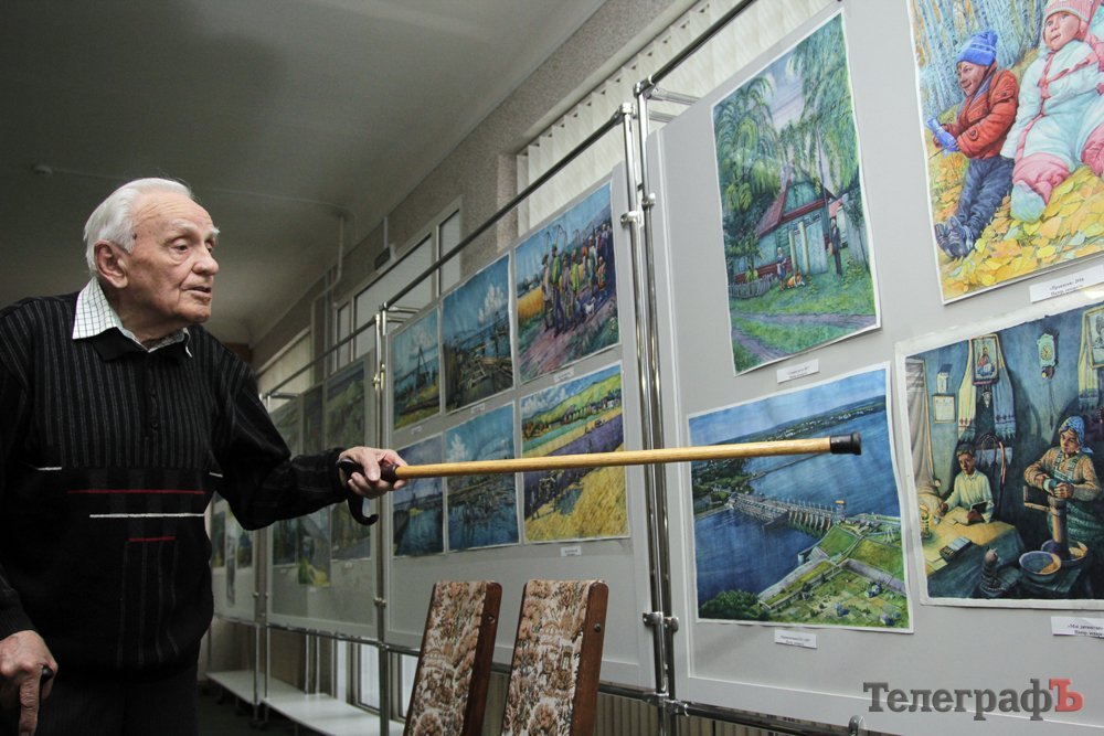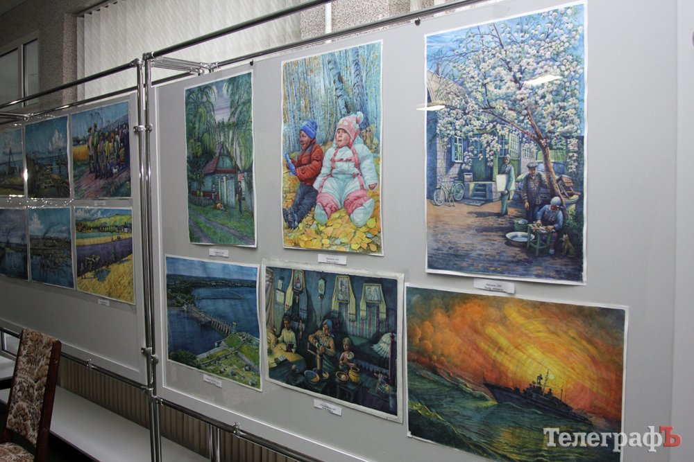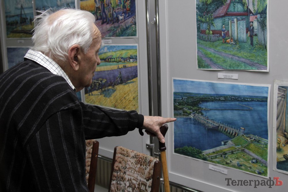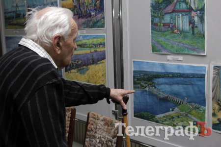 На виставці в Кременчуцькій художній галереї представлені 24 акварелі та чотири графіки на тему історії Кременчука та власних життєвих спогадів. Але, доки діяла виставка, Маестро написав ще один «свіжий» твір: «Чумаки ремонтують воза». Ця акварель вже стала частиною експозиції. Тож поспішайте побачити колоритні чумацькі сюжети, розлогі степи, відчути пахощі куліша при місячному сяйві, далекі події приїзду імператорських осіб та Кременчук початку ХХ століття з червоними трамвайчиками і прекрасними соборами. Всім відома акварель із першим залізничним мостом через Дніпро. Таку картину художник повторив майже 100 разів, настільки вона популярна! А поруч із історичними картинами та першими яскравими спогадами дитинства втілена сучасність: всім знайомий сквер ім. О.Бабаєва на тлі військового шпиталю, портрет милих серцю правнуків. Відверто кажучи, таких майстрів акварельного живопису не так багато в Україні.