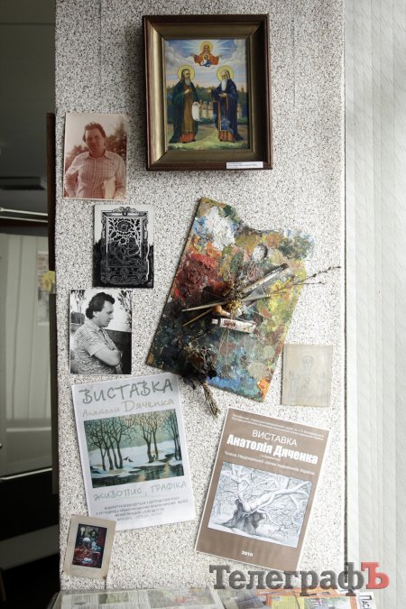 Також із родинного архіву представлені унікальні видання, статті, фото, авторські вітальні листівки, ескізи розпису церкви та останні твори Анатолія Дяченка. Ви зможете побачити, з якими матеріалами працював художник: пензлі, палітра та різці майстра.