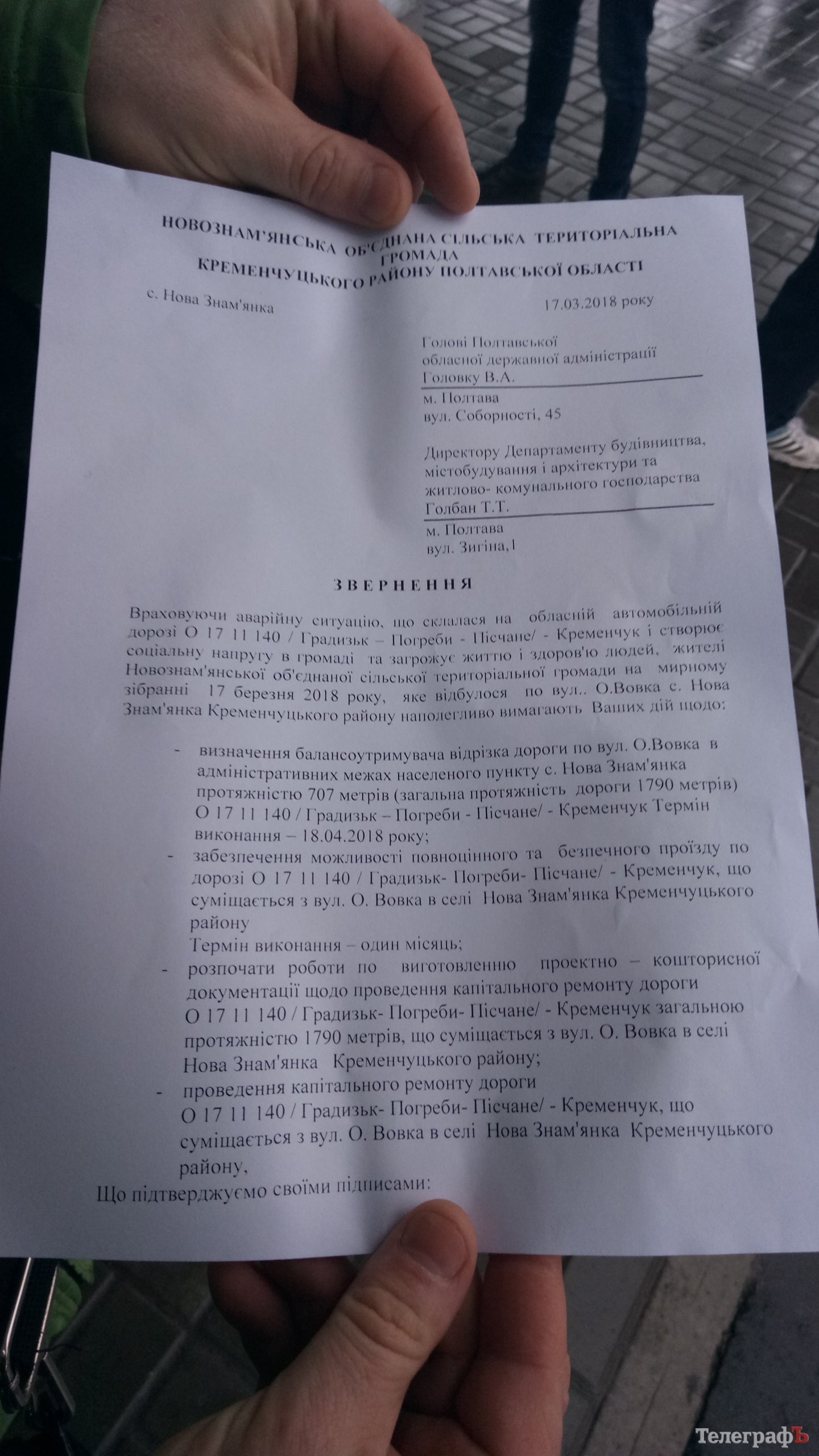 Сергей Безлунный, депутат Новознаменской объединенной громады сообщил «Телеграфу», что первое требование людей – чтобы область взяла дорогу на баланс, 800 метров, которые «висят в воздухе». После этого может идти речь о составлении документации для проведения ремонтных работ и финансирование ремонта.
