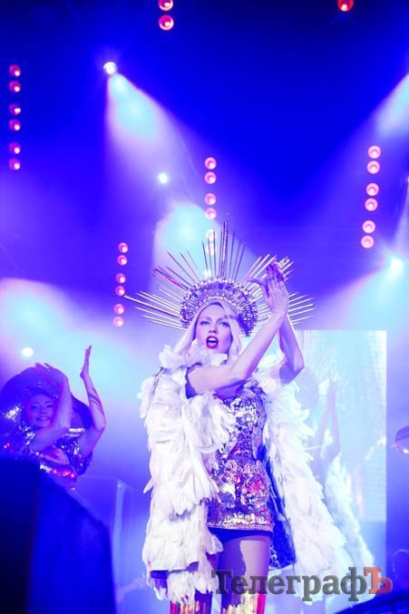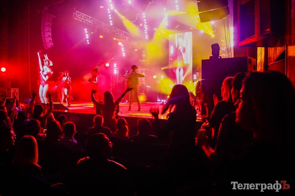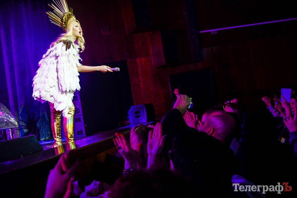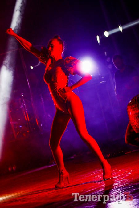 Вторая часть уже была более танцевальной и кременчужане потихоньку стали подыматься со своих мест и танцевать вместе с артисткой. Конечно, ведь суперблондинка со сцены пообещала, что у тех, кто не встанет и не будет танцевать, у того выростет ОГРОМЕННАЯ ПОПА. Так что танцевать встали даже мужчины. Видимо, испугались.