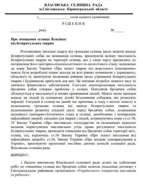 В проекте решения даже упоминают Закон Украины «Про захист тварин від жорстокого поводження» (то есть о том, что убивать бездомных собак в Украине запрещено авторы проекта, видимо, знают). И признают, что должны быть разработаны мероприятия по содержанию бездомных собак и строительству приютов. Однако в проекте говорится, что «этот вопрос требует определенного времени и значительного финансового обеспечения». И далее, ссылаясь на то, что собаки нападают на людей и разносят инфекции, авторы проекта решения предлагают следующее: