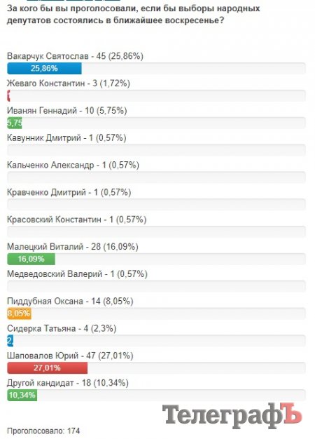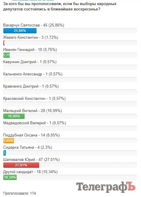 Проголосовало 174 человека, уже можно говорить о тенденциях: Вакарчук – 25,86%, Шаповалов – 27,01%, Малецкий – 16,09%, другой кандидат – 10,34%, Пиддубная – 8,05%. Будущего победителя Константина Жеваго в пятерке лидеров нет и в помине.