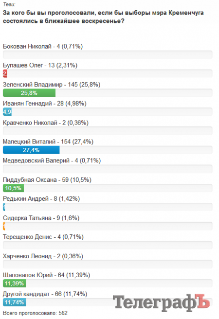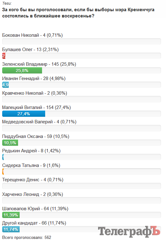 Голосование на сайте «Телеграфа» не имеет статуса социологического опроса. Его результаты не могут считаться результатами социологического опроса граждан Кременчуга.