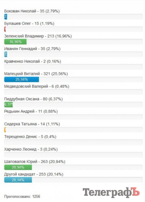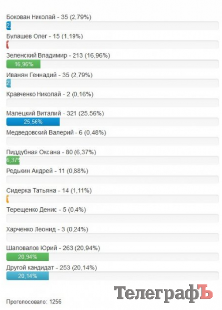 По результатам голосования, Виталий Малецкий набрал 25,56%, Юрий Шаповалов – 20,94%, «другой кандидат» – 20,14%, Владимир Зеленский – 16,96%, Оксана Пиддубная – 6,37%.