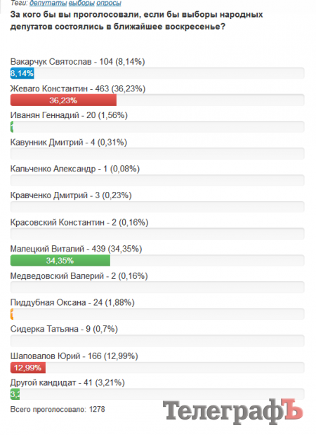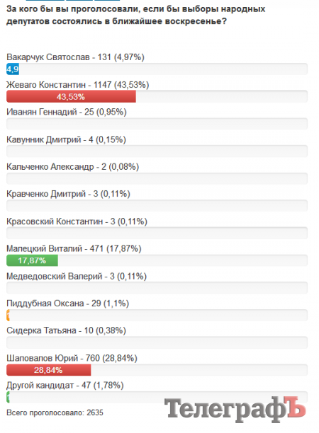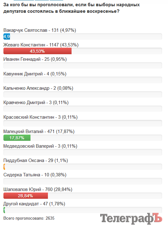 Проголосовало 1278 человек. Резкая смена ситуации. В лидеры вырывается Жеваго – у него 36,23% (463 голоса). У Малецкого 34,35%, у Шаповалова – 12,99%. С этого момента Жеваго стремительно набирает очки, его конкурентам так и не удалось переломить ситуацию.